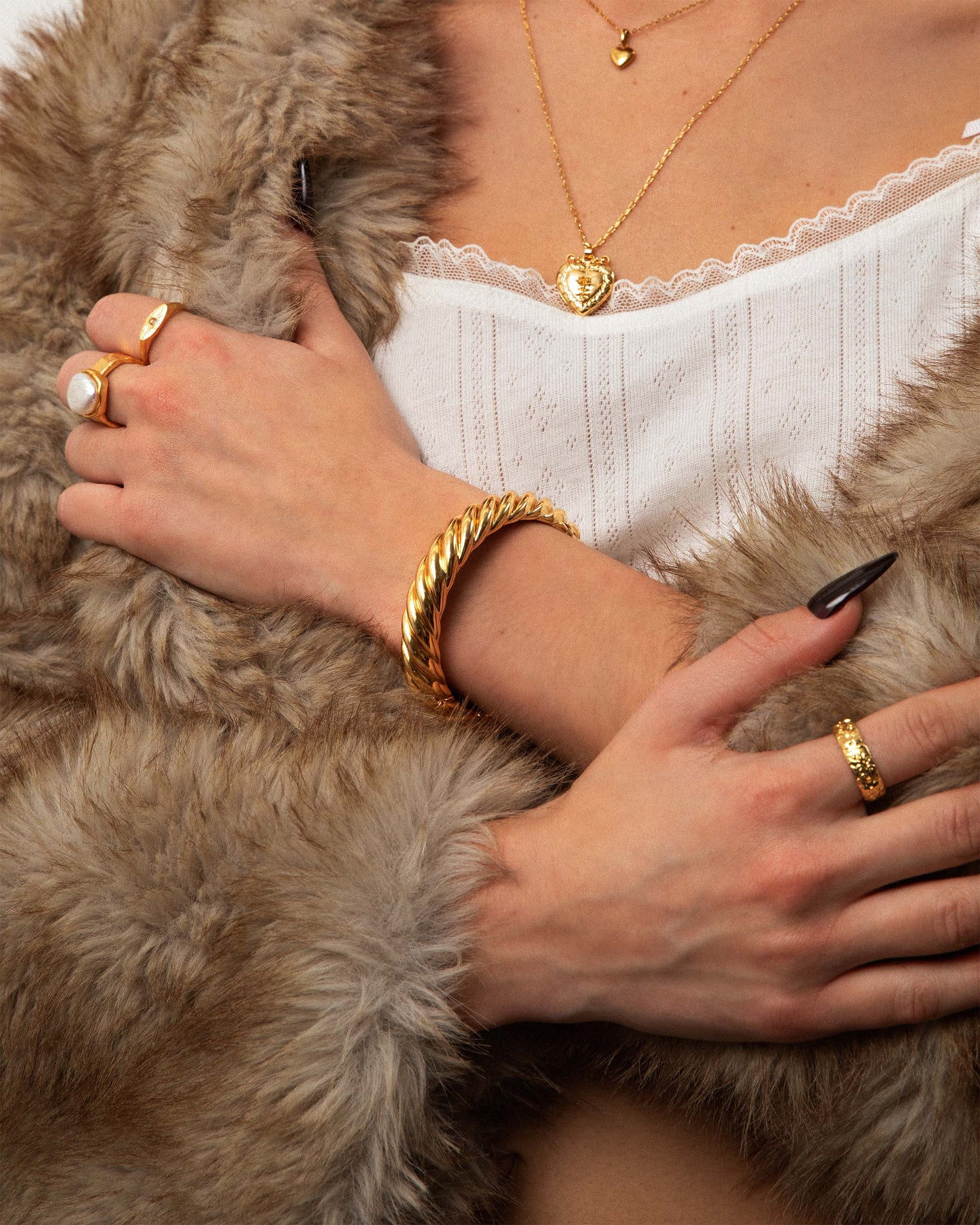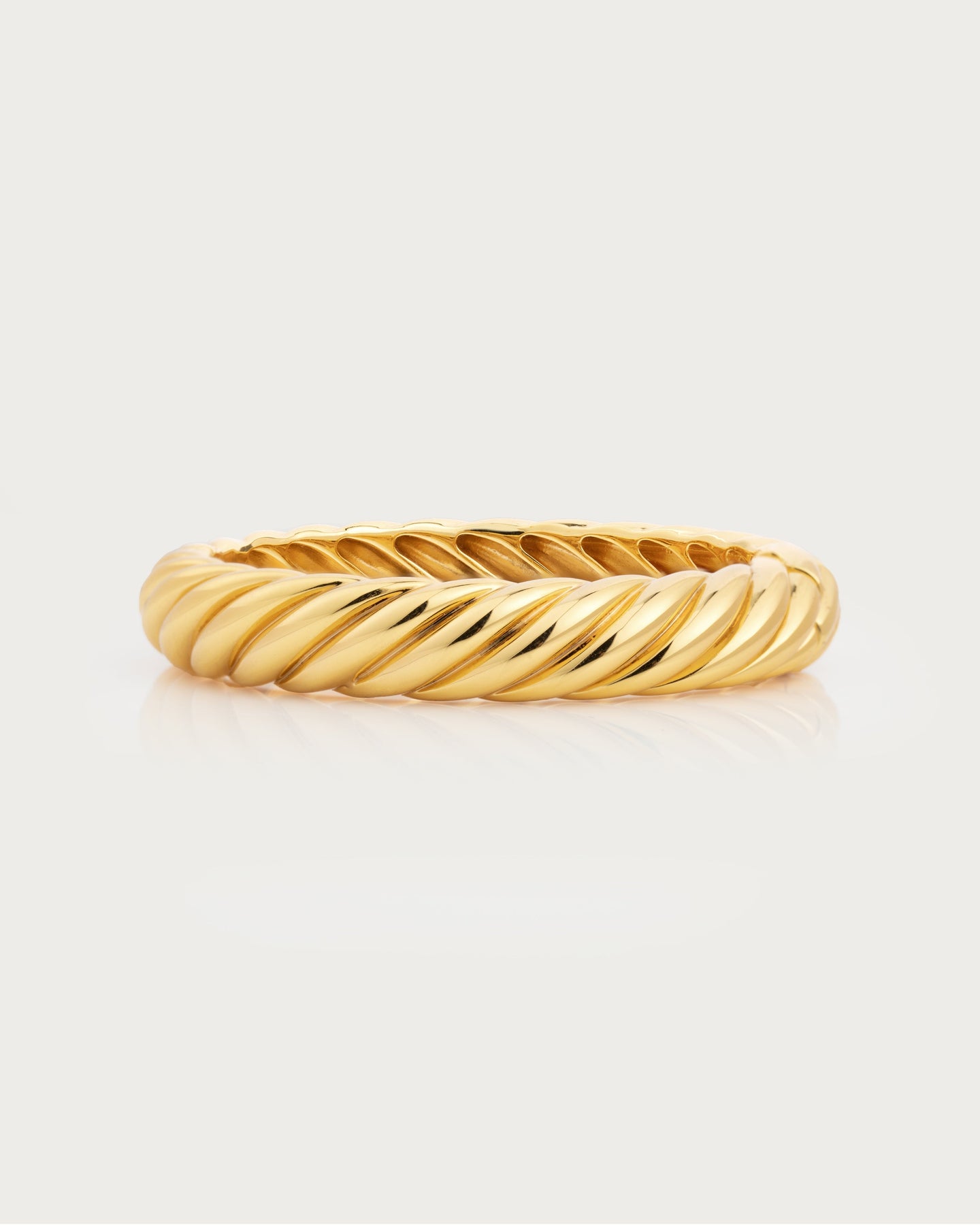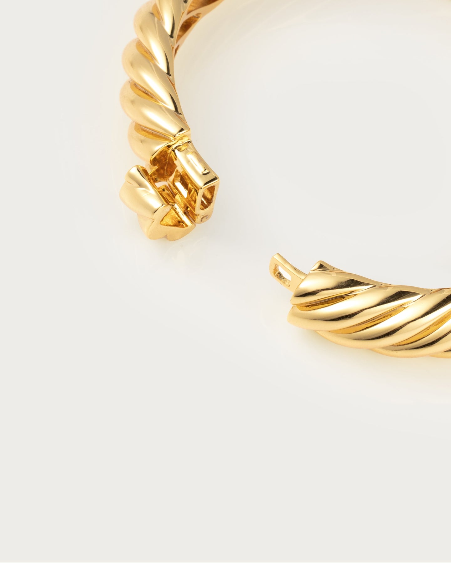 A bold statement bangle with a sculptural twist. This high-polish gold piece features a chunky braided silhouette and a hidden clasp for effortless wear. Eye-catching yet easy, it’s designed to elevate your everyday stack with both form and function.