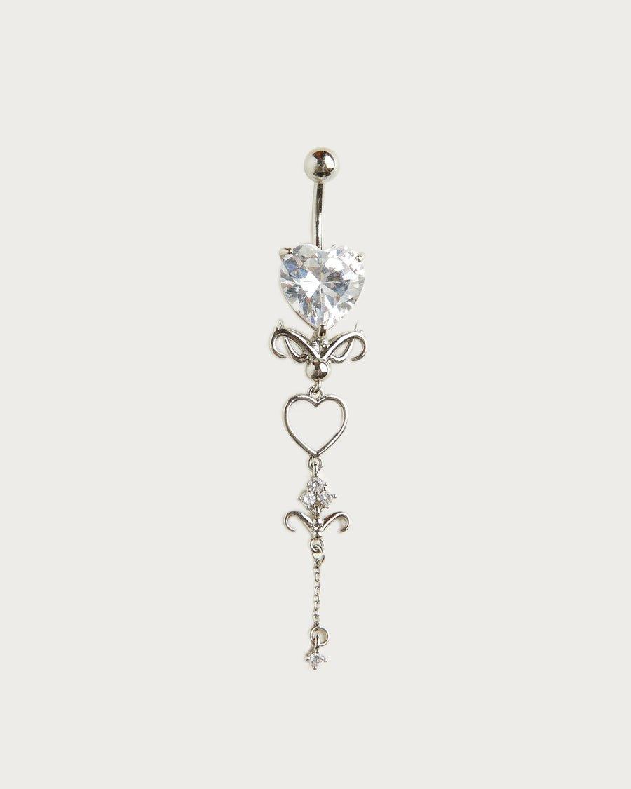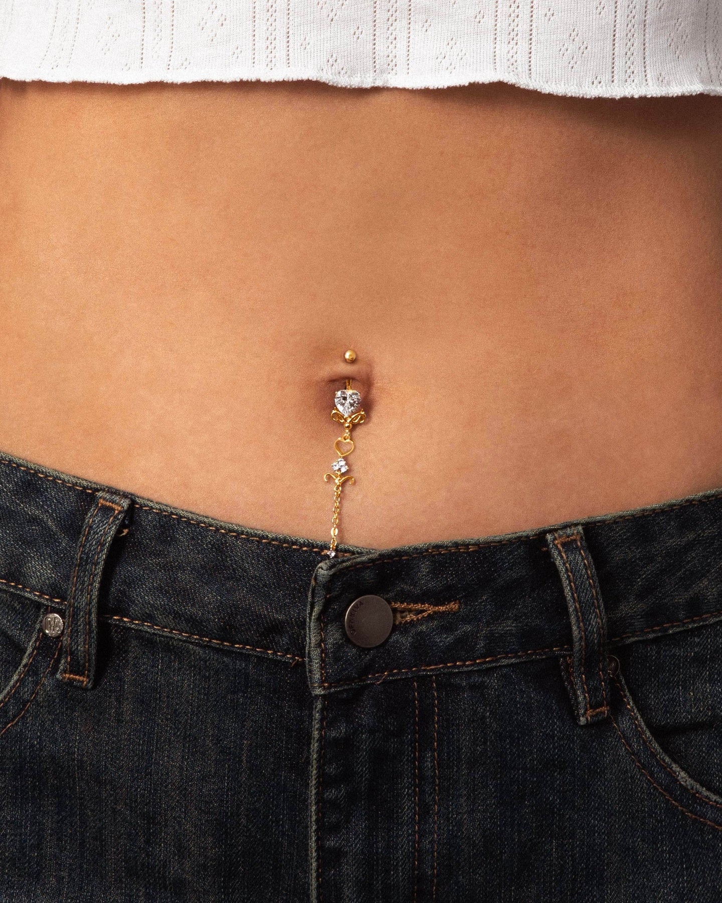 The Dripping Belly Ring combines symmetry and softness with a heart-cut CZ stone at the center, anchored by delicate filigree and a single dangling chain. An ornate cascade of heart and stone offers just enough movement to feel alive.
