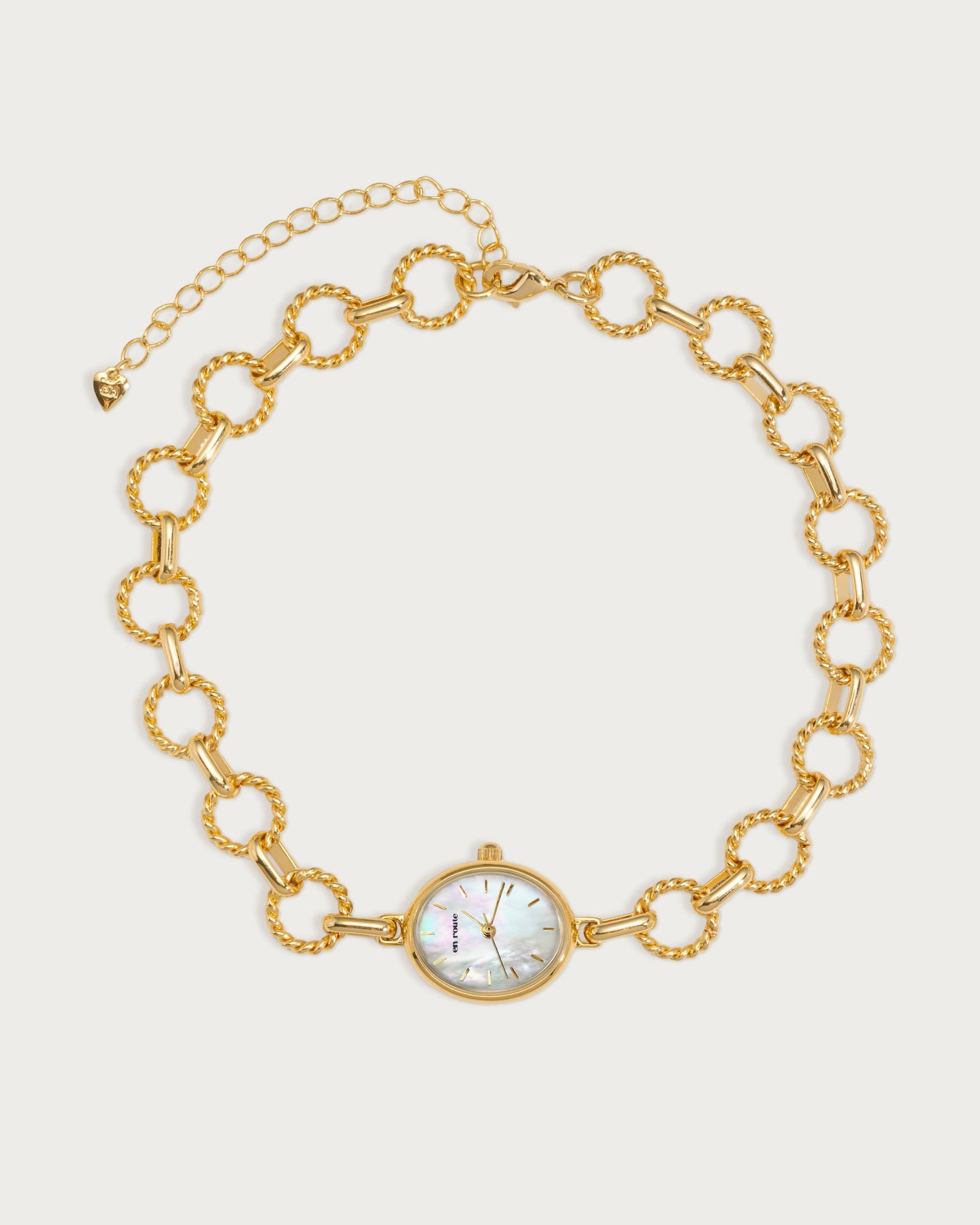 This watch necklace with alternating textured and polished links glows like late afternoon sunlight on skin, warm, languid, and intoxicating. A mother-of-pearl dial shimmers at its center, powered by precise quartz movement and splash-resistant for wherever the day takes you. Let this timepiece choker wrap your neck, holding every golden hour close.