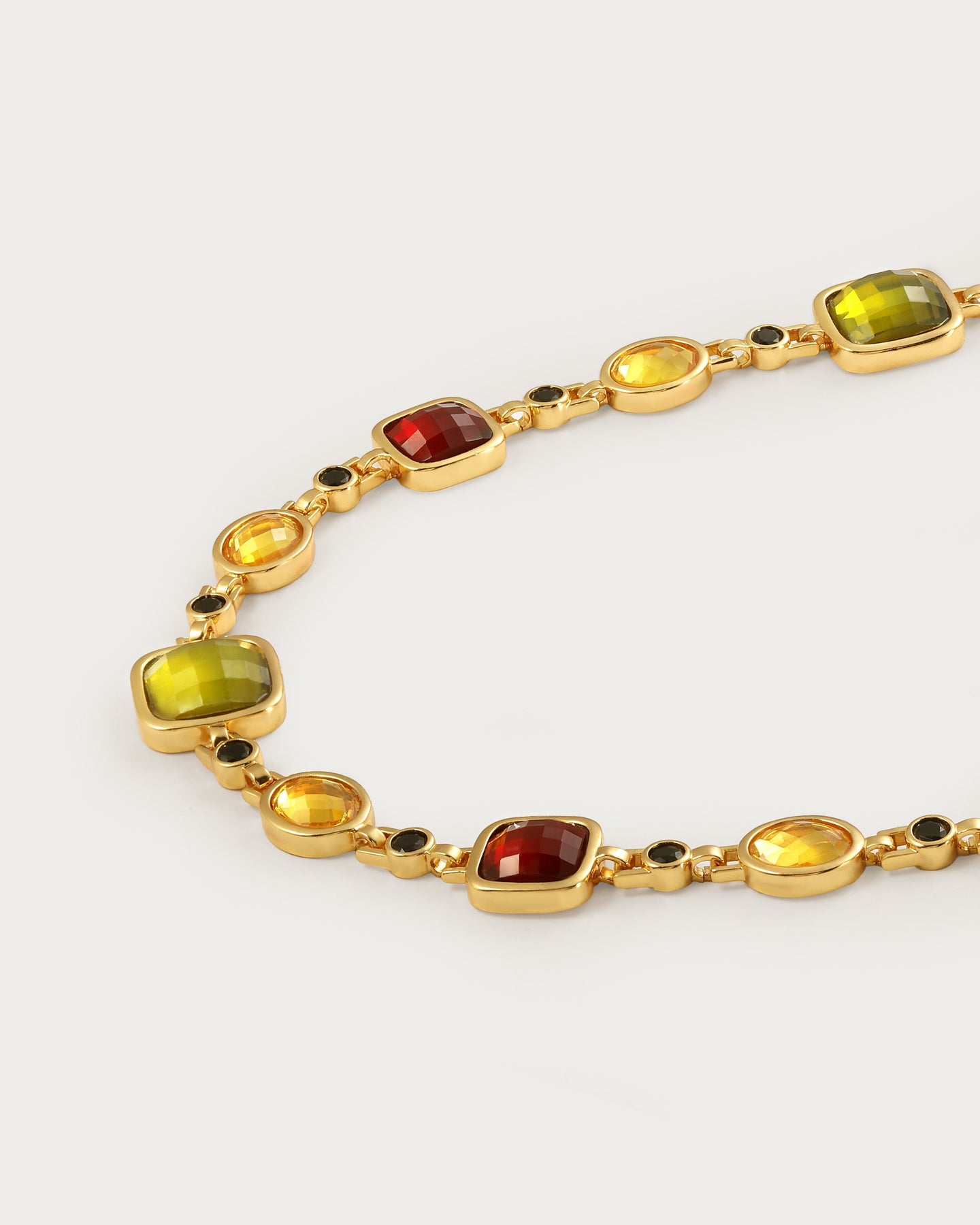 Harmonia, the Greek goddess of harmony, inspires this colorful choker. With shades of olive green, gold, and ruby, it strikes a bold yet balanced look. The vintage-inspired beads, in square and round shapes, feature intricate cuts reminiscent of stained glass. Retro and eye-catching, Harmonia’s palette stands out as a true reflection of her essence. Wear it solo or pair it with our Harmonic Hour Multicolored Watch Bracelet.