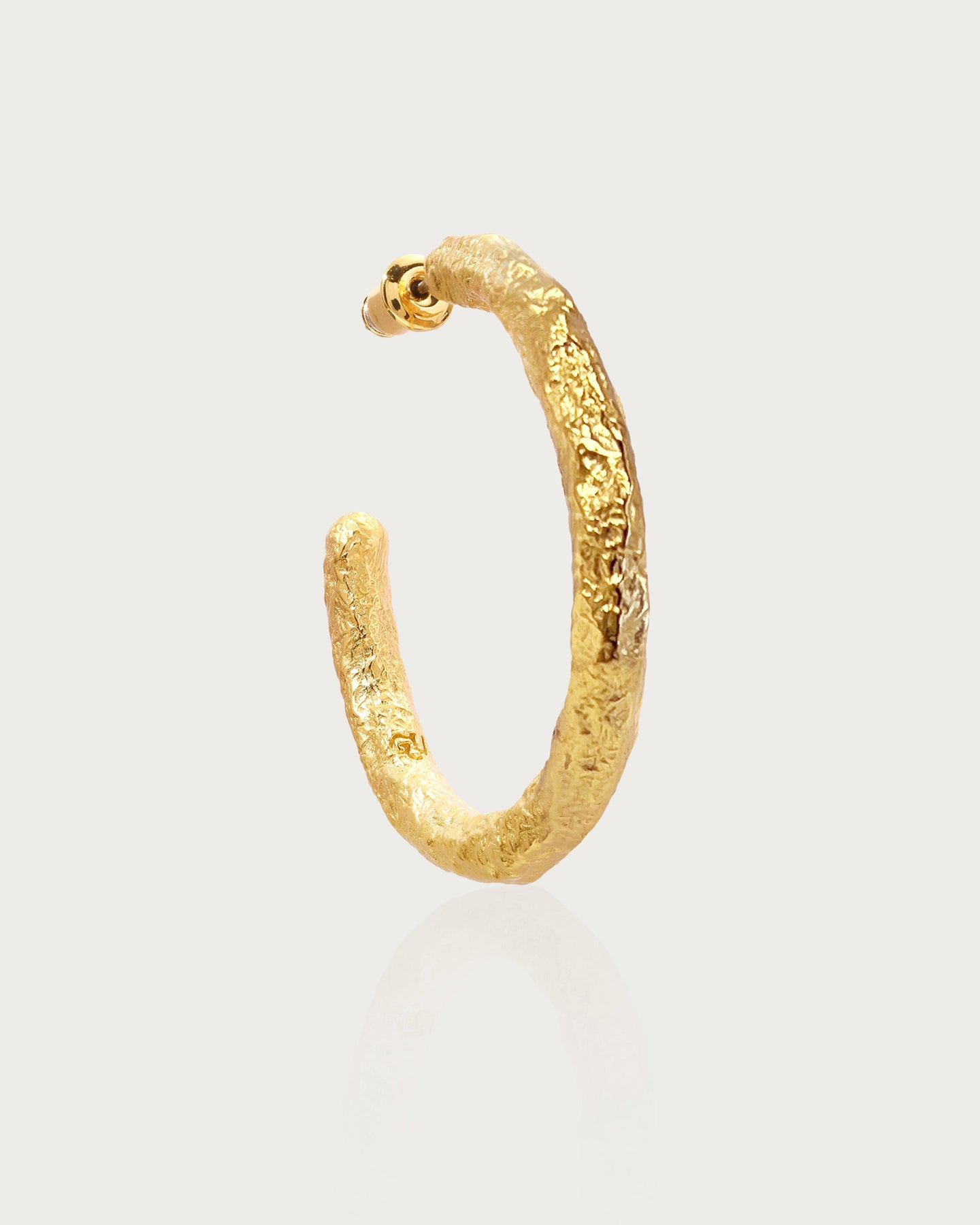The Jenny Large Hoops exude a raw, elemental aura with their molten, sculptural texture. The finish was carefully developed from hand-sculpted wax models and refined through multiple iterations to achieve the ideal surface. The silhouette balances bold presence with a touch of elegance. This is the kind of piece that shifts your energy the moment you put it on. Quietly powerful. Unmistakably you.