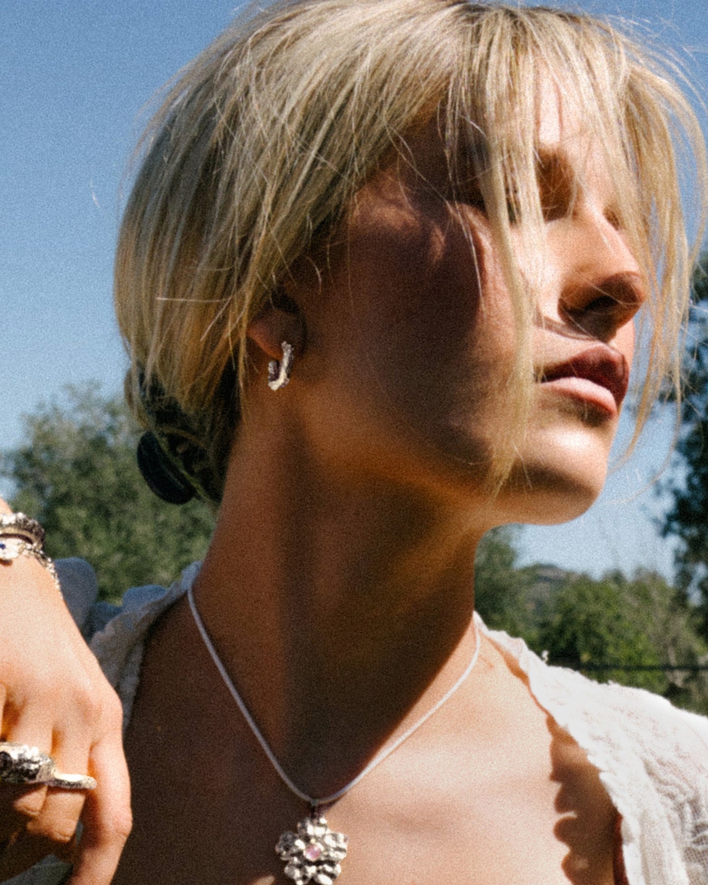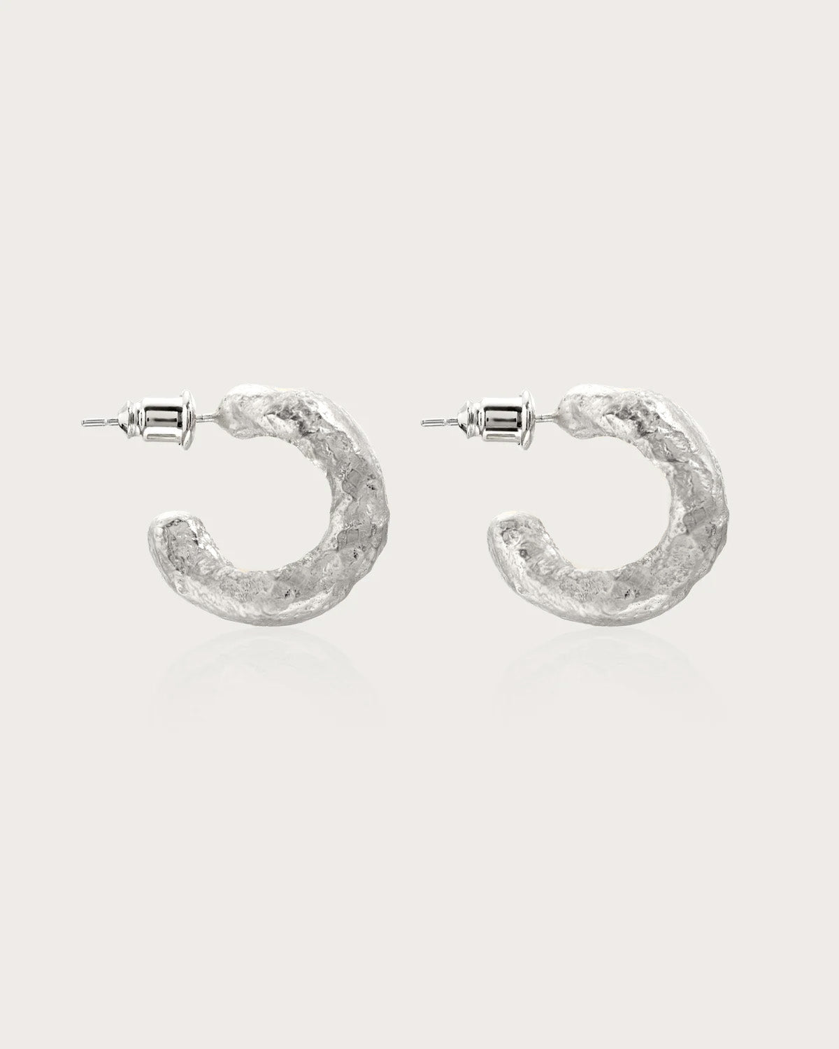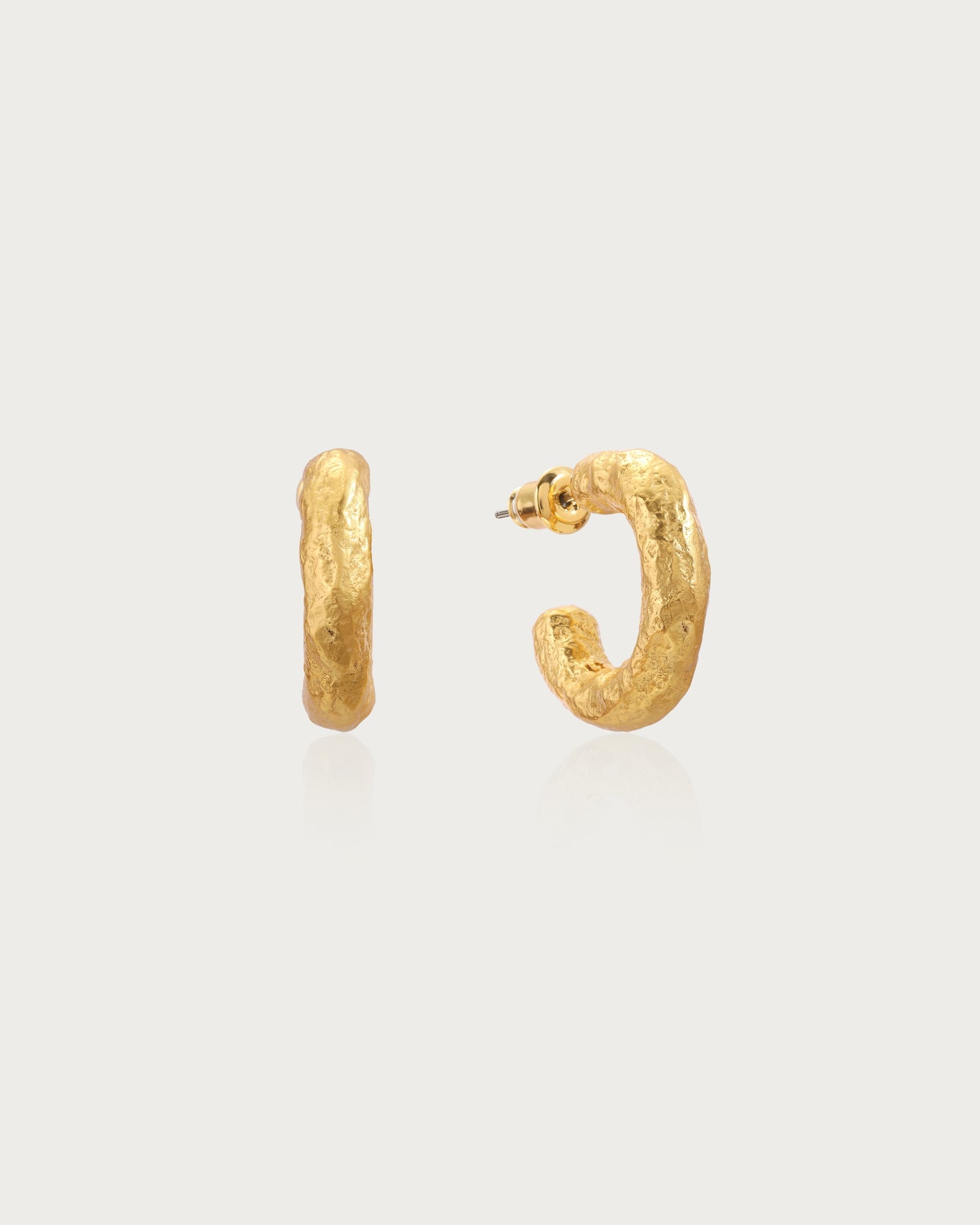 These hoop earrings exude a raw, elemental aura with their molten, sculptural texture. Each curve bears the marks of careful hammering, giving them a tactile, sculpted presence. They do not sit still and neither should you. Slip them on and feel that subtle shift, softer shoulders, slower breath, a little more you.