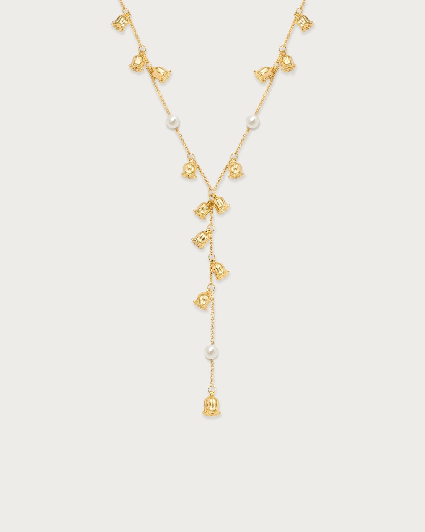 This lariat necklace is all about elegance and flow, featuring delicate lily-of-the-valley pendants interwoven with lustrous pearls. Its breezy, long design pairs perfectly with dresses, trench coats, and button-down shirts, creating a look that’s effortlessly chic with a hint of surprise. A must-have for those who love a touch of romance and versatility in their accessories.