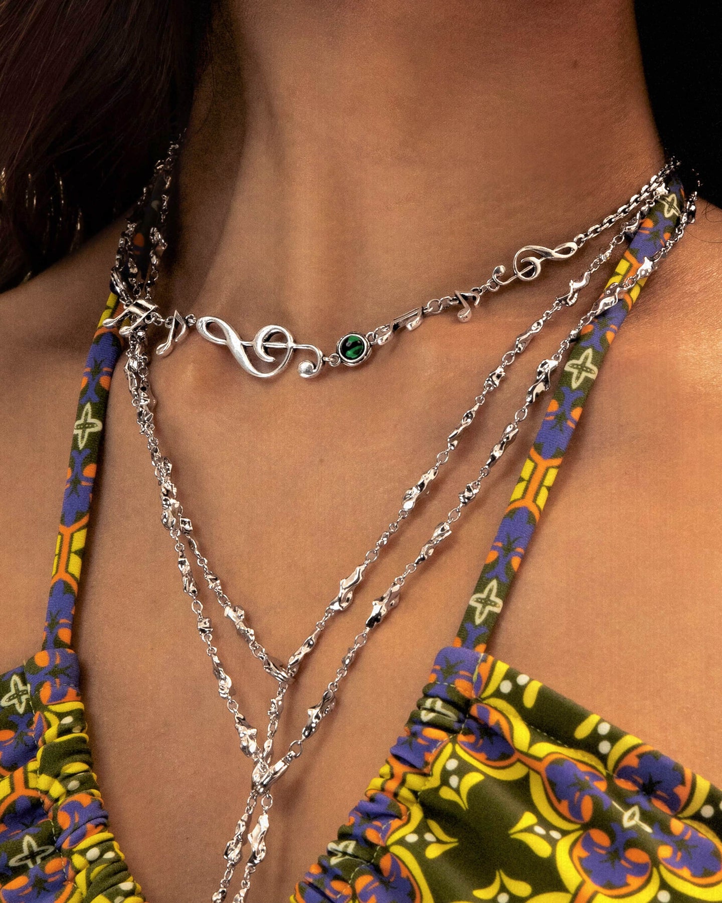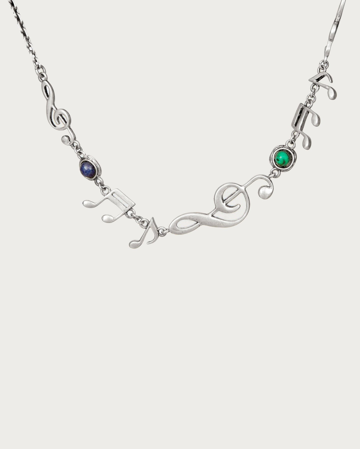 Listen — to the rhythmic sounds of a coffee machine, the cheerful steps of a walk, and the laughter during toasts at night. Music adds color to our life. Inspired by the treble clef, we capture the wonderful music notes in our life, which boasts a distinctive black patina finish, adding a touch of vintage charm to the shimmering silver. We wish for the melody to always be close to your heart, reminding you of joys both now and then.
