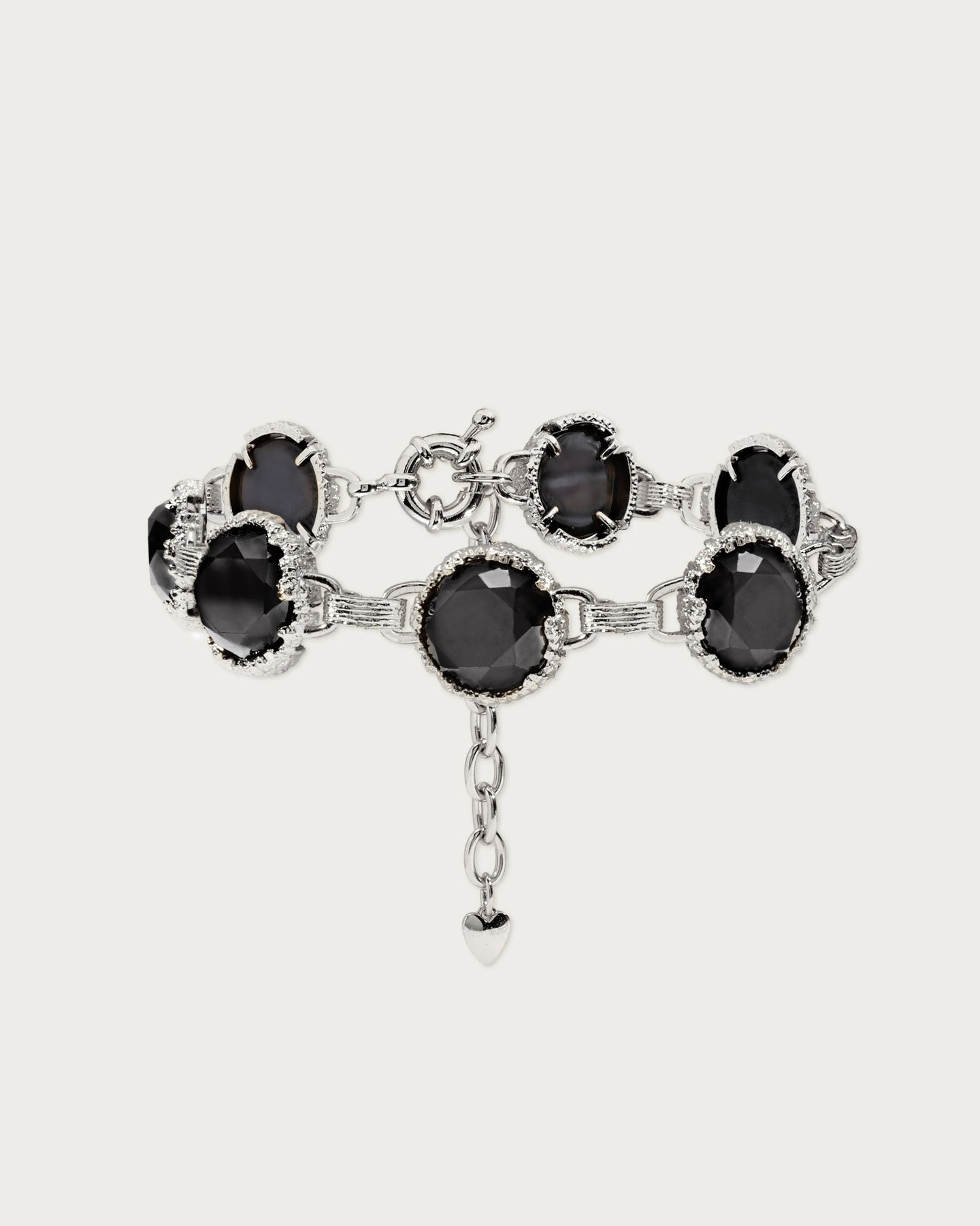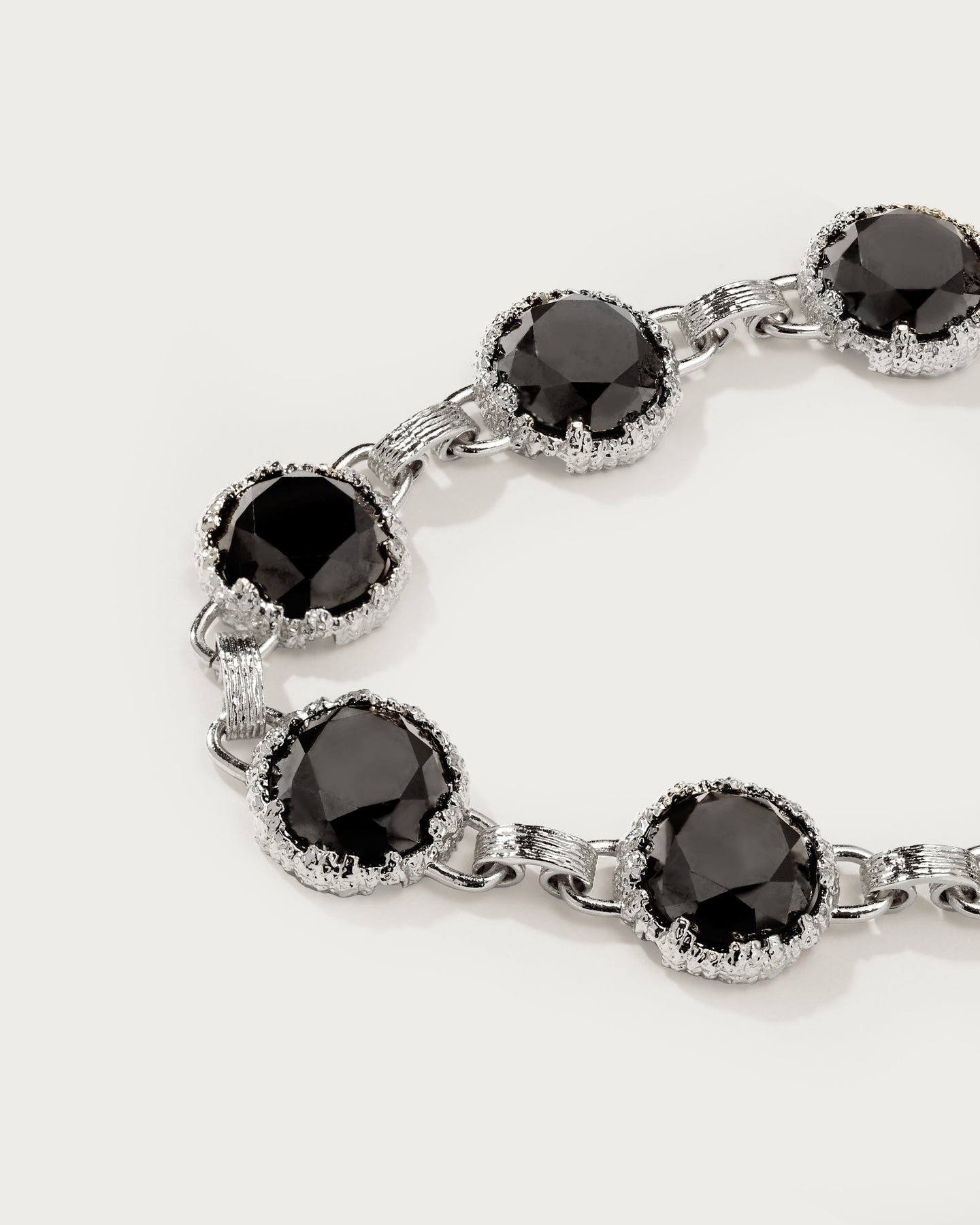 Dark elegance, reimagined. The Midnight Quartz Bracelet features six faceted black zircon stones, each encased in an ornate claw-set bezel that evokes vintage glamour with a modern edge. The stones are framed by intricate textures and connected with ribbed links—creating a rich interplay of sheen and shadow. It’s a statement piece that demands attention—subtle in tone, striking in presence.
