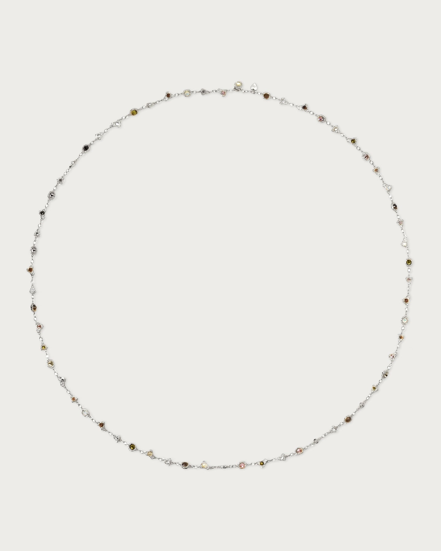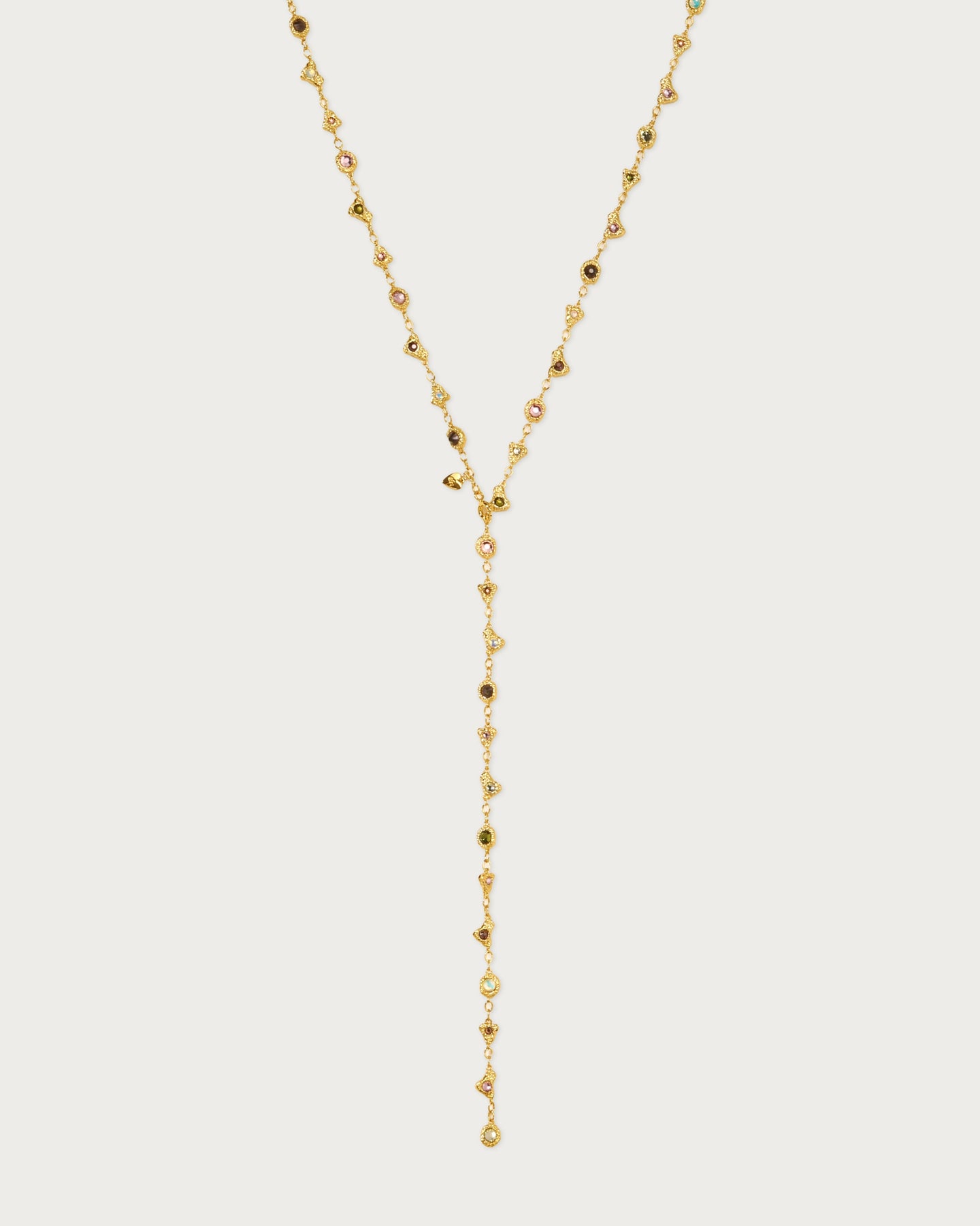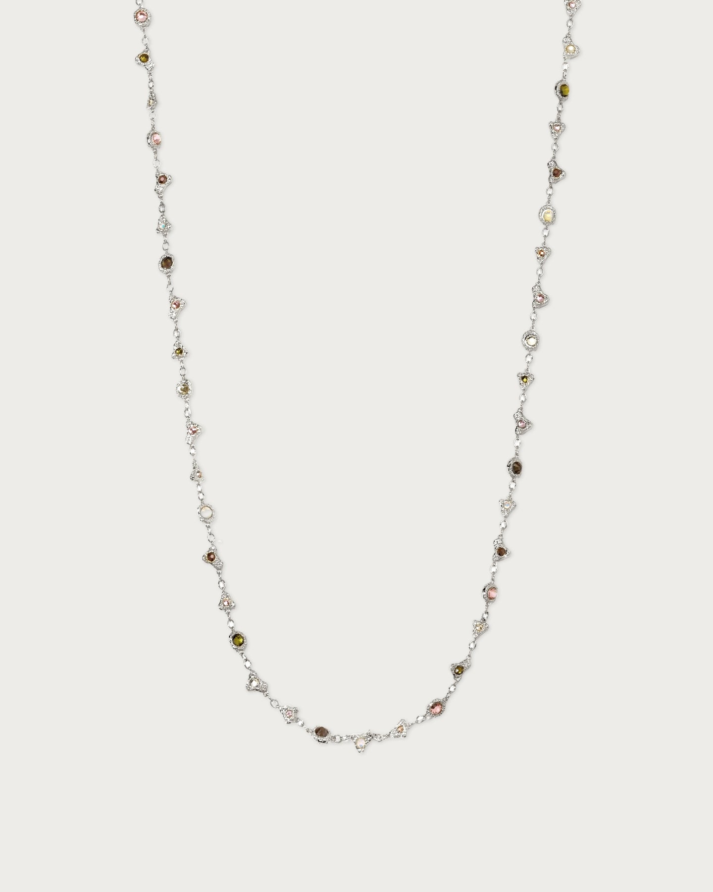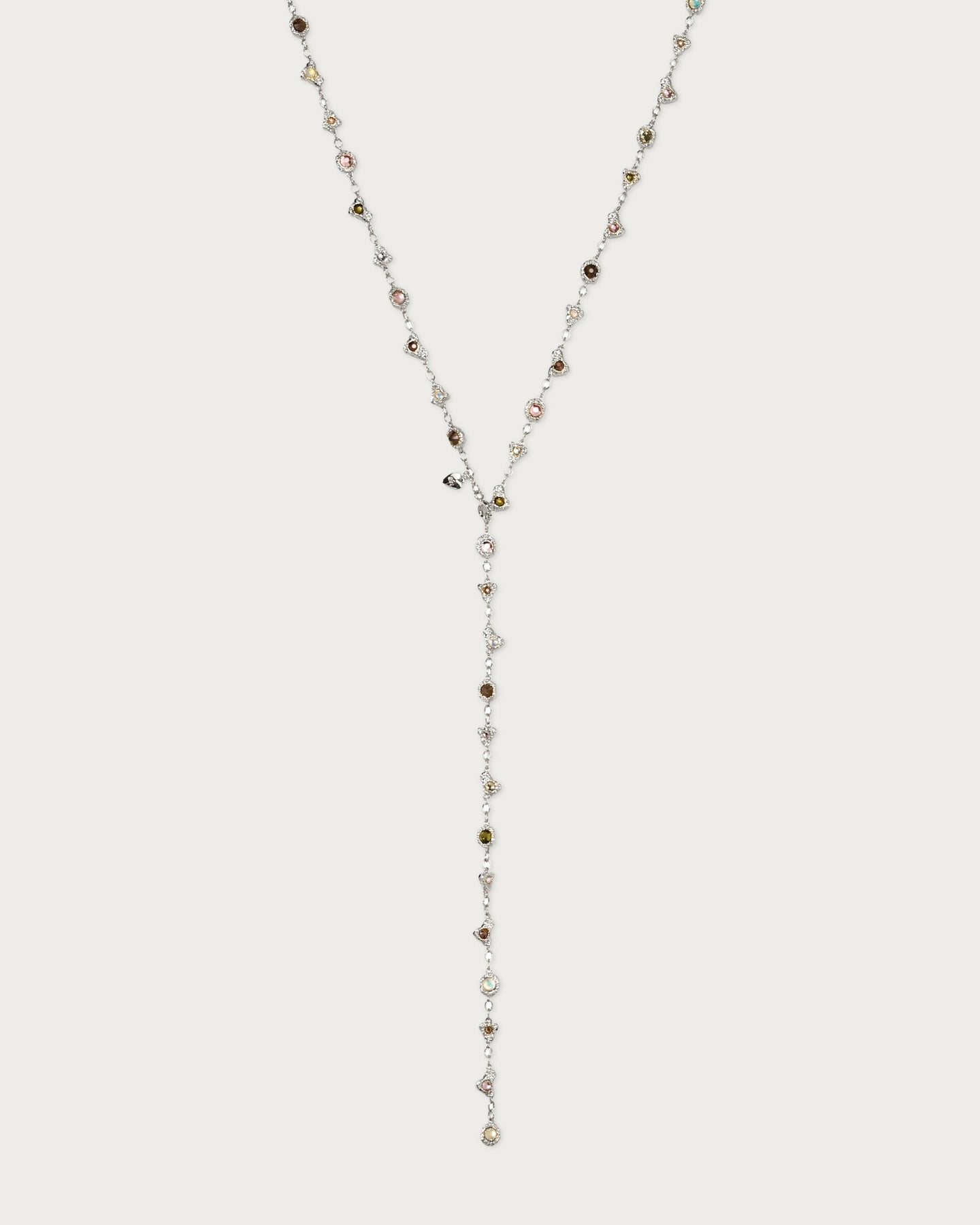 A study in contrast and color, the Multicolor Crystal Long Chain brings together vintage texture and modern vibrancy. Scattered along its antique-inspired links are an array of crystals in circular, oval, and triangular shapes. Each stone adds a unique note of color—bluish pink, smoky brown, fresh green, and clear iridescent tones—creating a layered palette that feels both refined and playful.This versatile piece features an adjustable chain that seamlessly transitions from a classic long necklace to a chic Y-chain—or even a waist chain for added styling play.