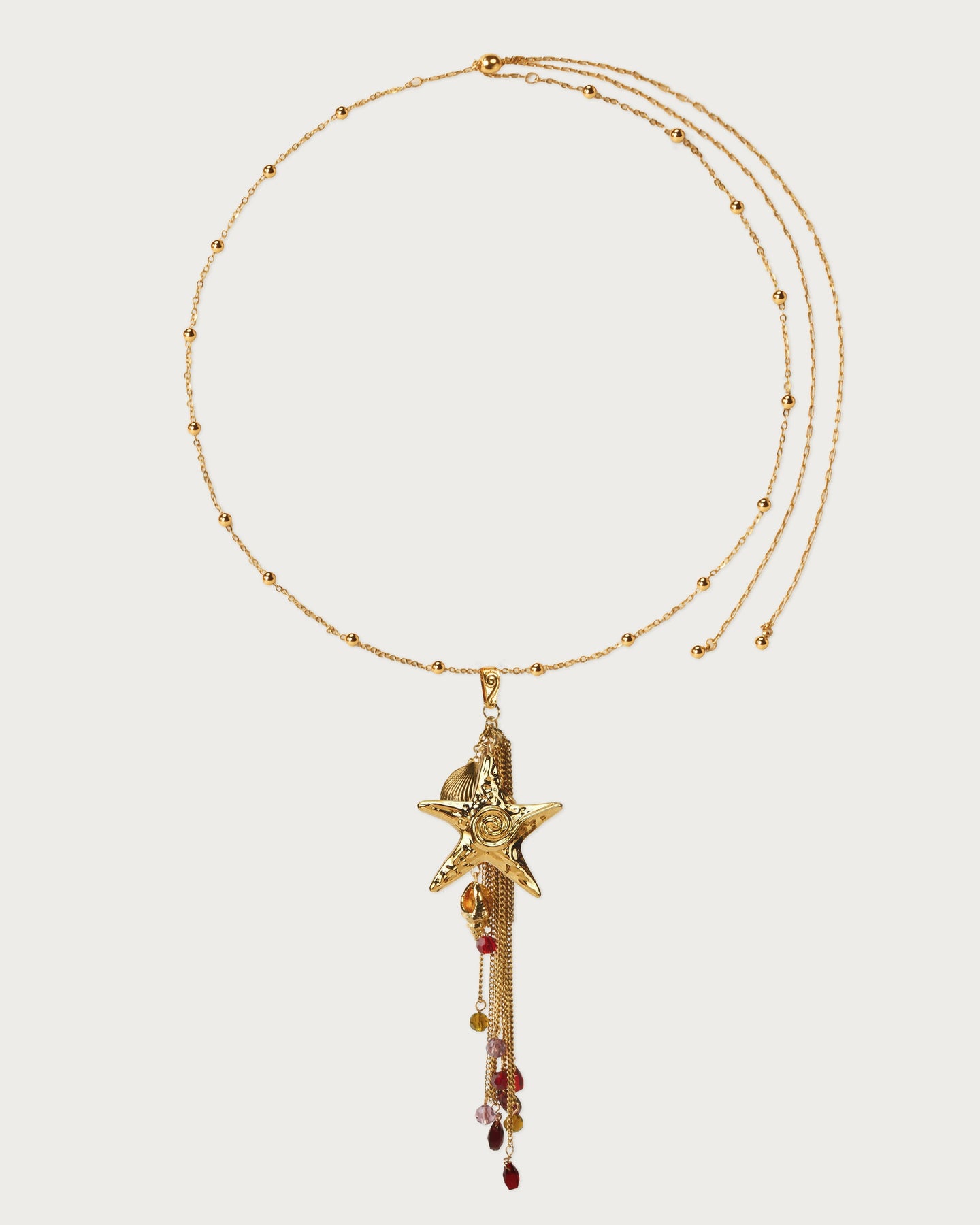 The versatile Starfish Drop Necklace brings ocean treasure to your everyday style. A smooth sliding bead lets you adjust the length effortlessly, shifting from a high choker to a low, flowing drop. At its end, tassels sway with weathered shells, spiral sea treasures, and colorful stones that feel like keepsakes from distant shores. It’s a piece for the free spirit who loves the sun on her skin, the wind in her hair, and the quiet joy of a life that moves as fluidly as the tide.