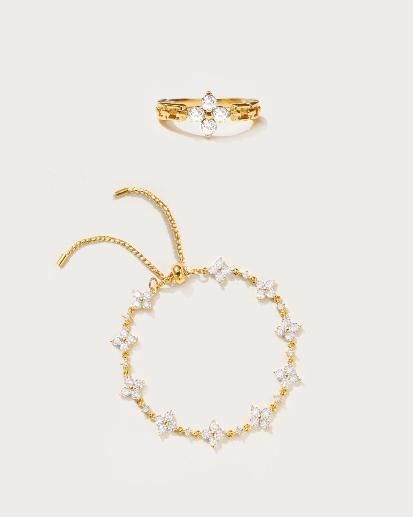 This set contains Lucky Clover Ring in Gold, Sparkle Clover Bracelet