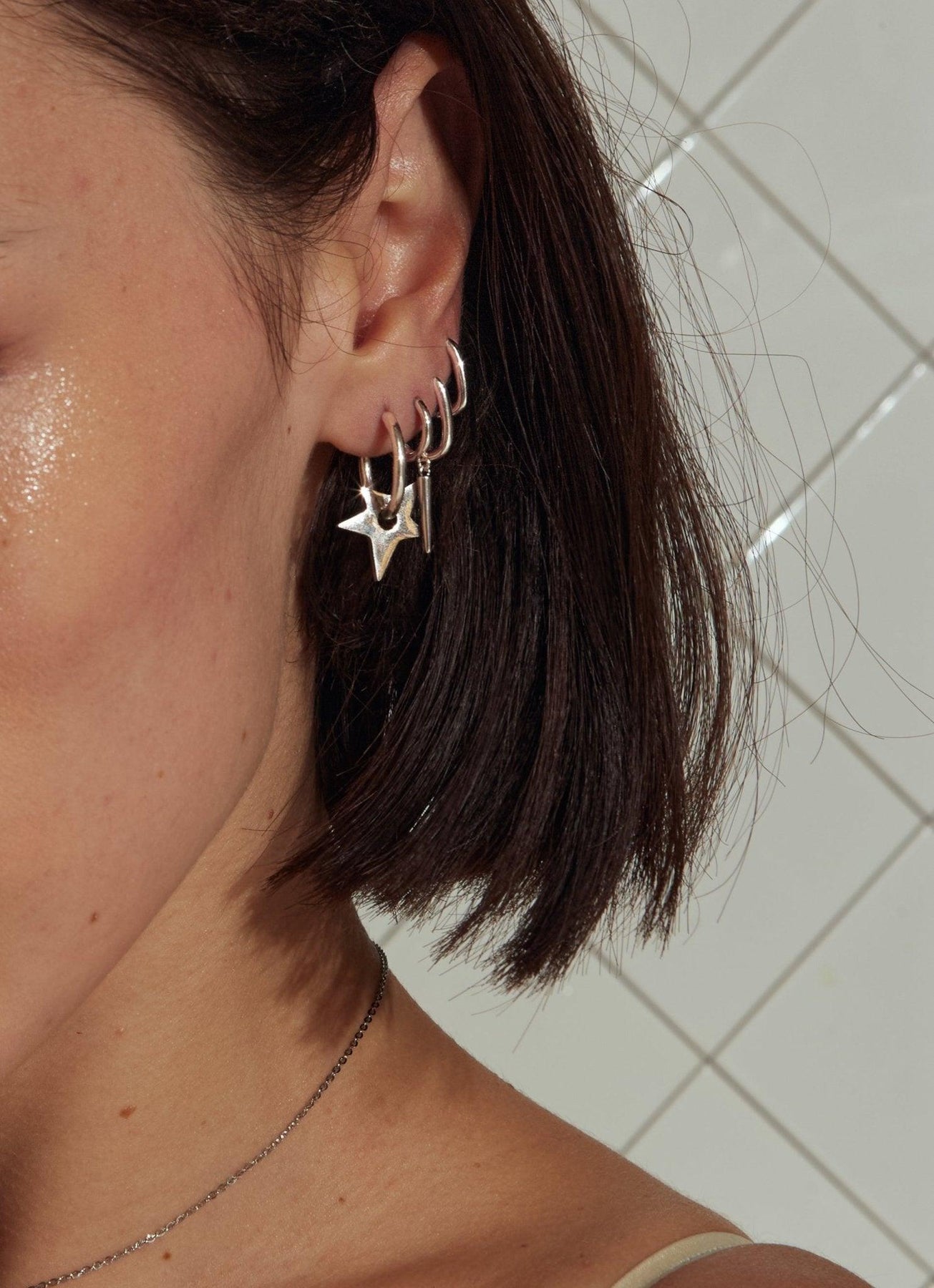 The impression you leave on others is like a shooting star across the night sky, beautiful yet fleeting. A hoop and a star, a dance of silver in the sky of style. Wearing our uniquely designed irregular-shaped star pendant, spin your tale of cosmic charm, where every turn is a twinkle, and every step is a sparkle.
