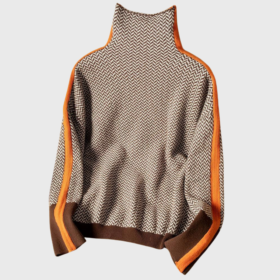 Тази блуза съчетава съвременен дизайн и уникални детайли, които правят цялата разлика. Геометричният мотив ѝ придава изискан и модерен вид, докато страничните ивици добавят динамика и подчертават силуета. С висока яка и безупречно изпълнение, тя е перфектният избор за тези, които търсят комбинация от комфорт и елегантност в една дреха. Идеална за ежедневни визии с моден акцент или за градски стил, изпълнен с характер.