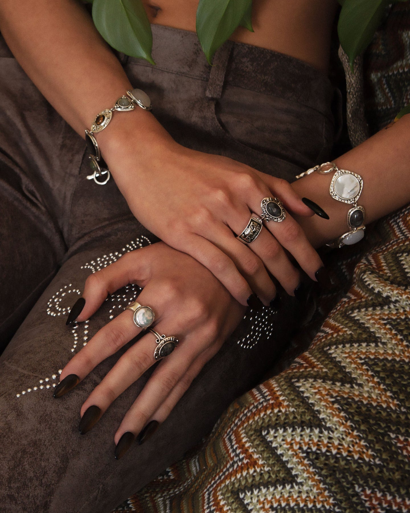 - Materials: Athena Bracelet - silver plated brass, mother of pearl, aventurine, tiger eye stone, moonstone, agate, abalone shell, tiger eye stone; Iris Ring - silver plated brass, baroque pearl