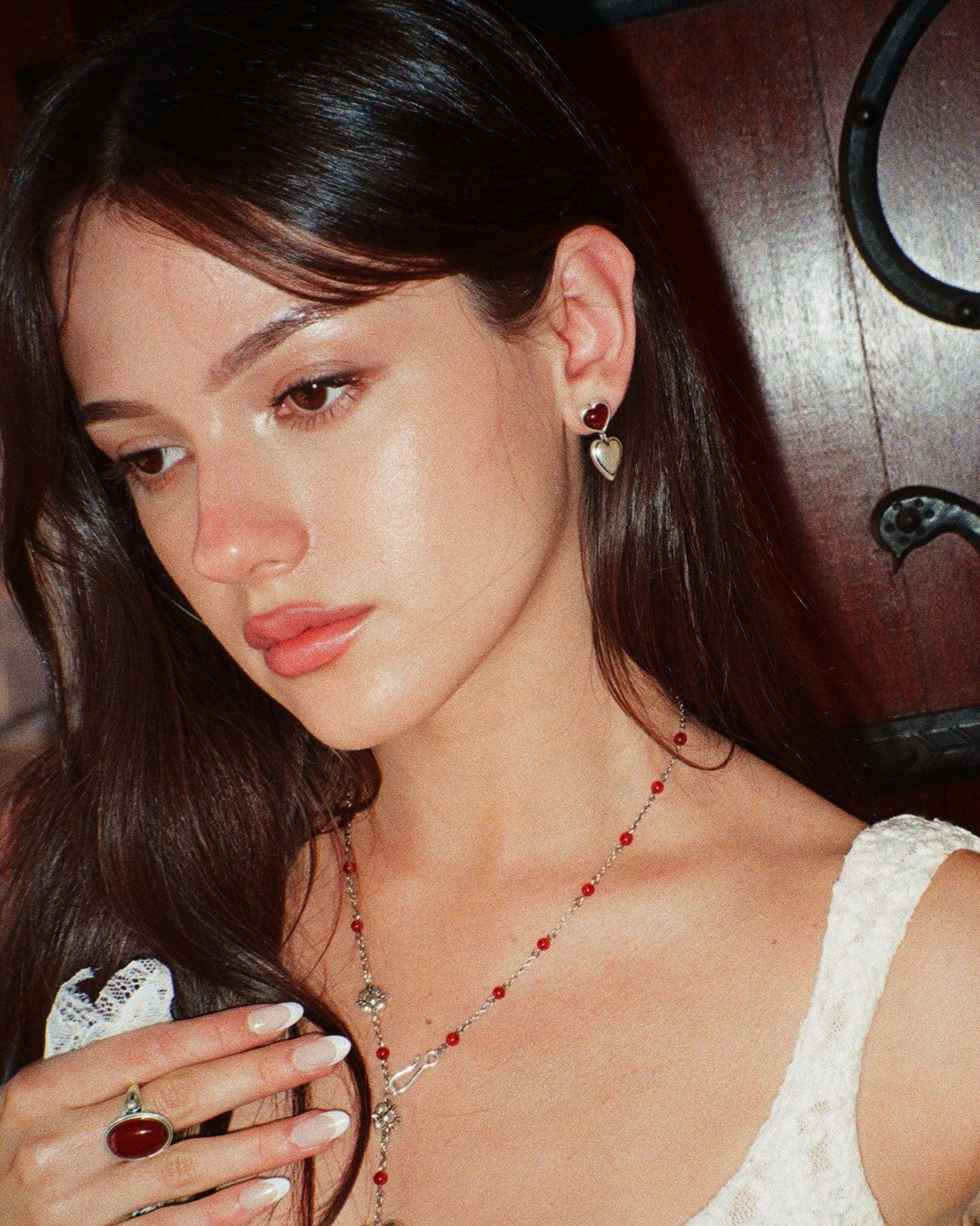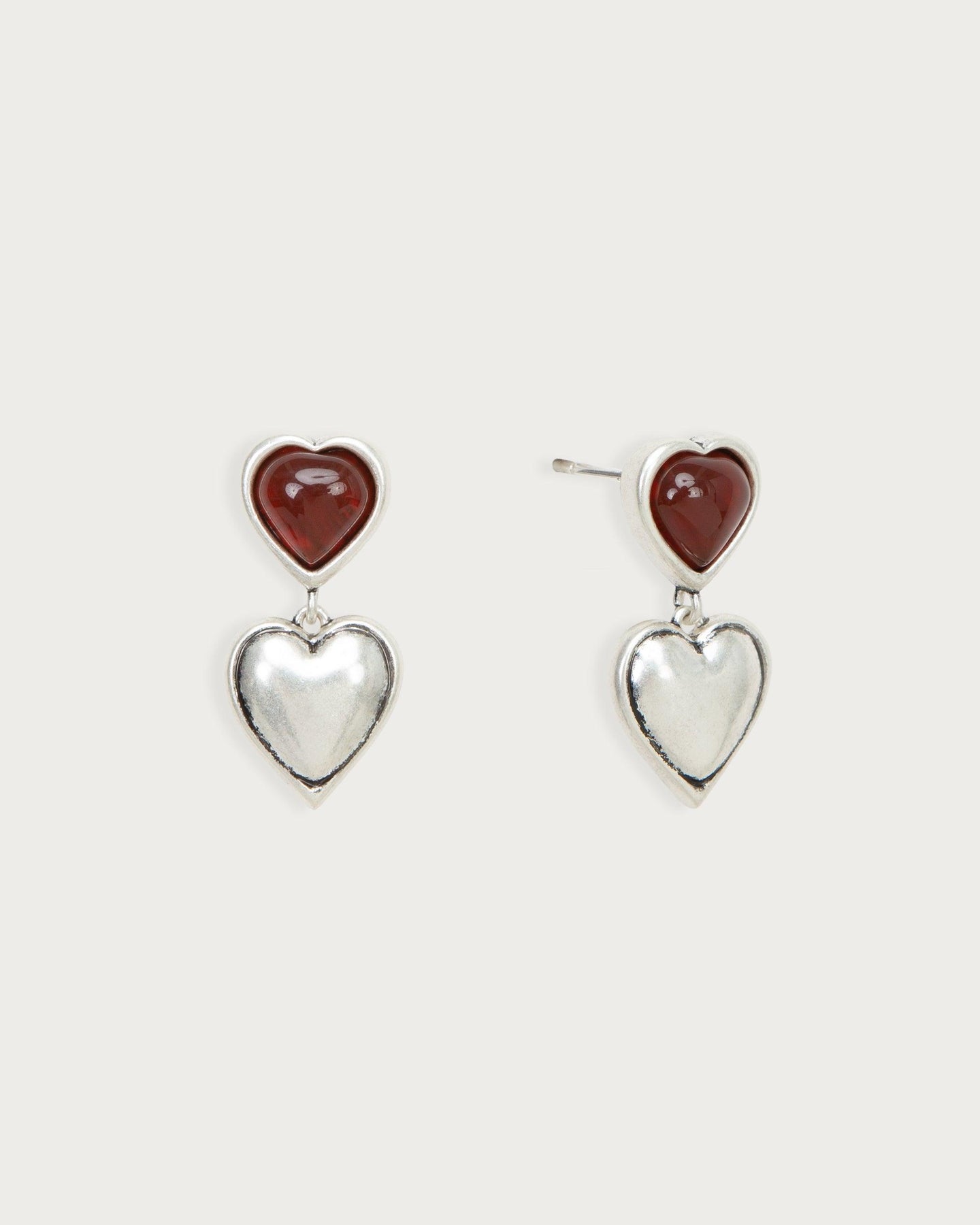 A love letter in stone and silver. These earrings pair heart-shaped carnelian stones, each naturally unique, with a silver-toned antique heart charm suspended below. Cool-toned and full of contrast, they carry a subtle tension between softness and strength. No two pairs are ever the same, just like every story they’re worn to tell.