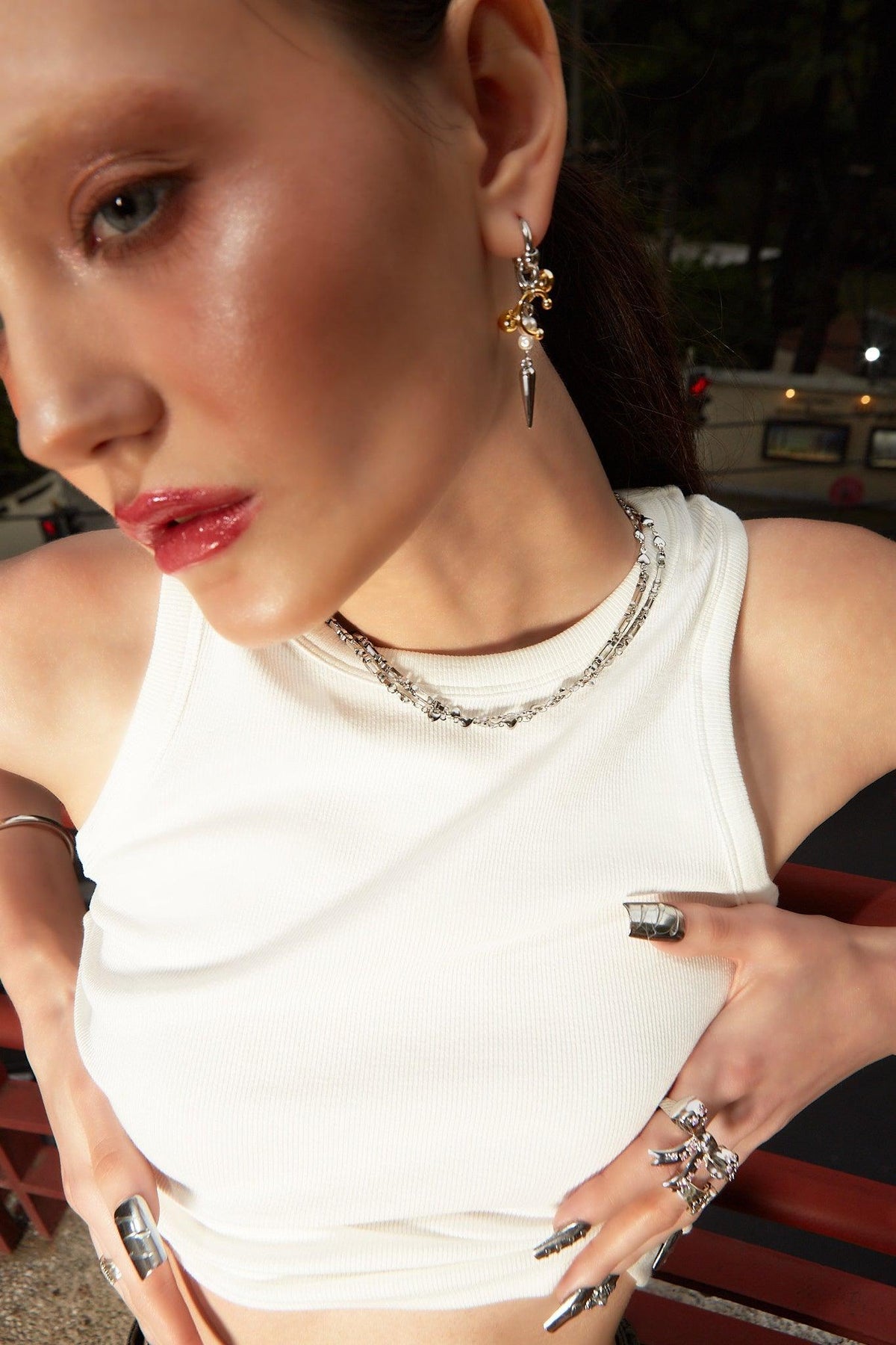 Calling all midnight dancers! You are the muse everyone gazes upon; your moves, radiance, and creativity are pure allure. We admire your carefree spirit and want to enhance your shine. With this intricate design featuring delicate, shiny pearls, spikes and barbells, we aim to encapsulate your enigmatic essence and mix it even further. Let's twirl together, and may your style steal the spotlight!