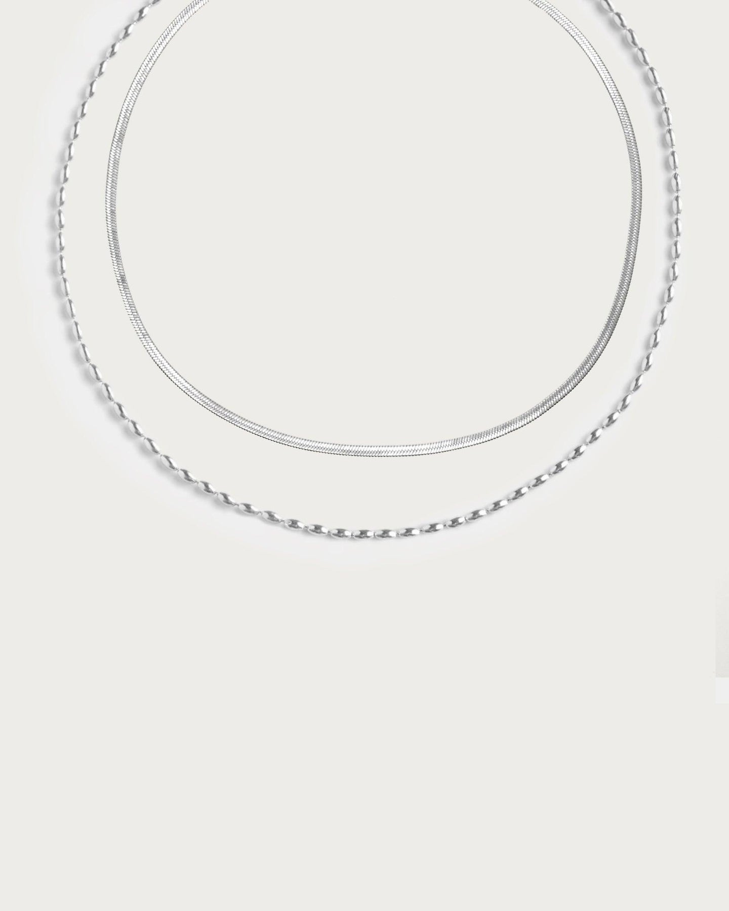 This necklace set contains 1 x 3mm Herringbone Chain Necklace in Silver, 1 x Mini Metal Beads Necklace