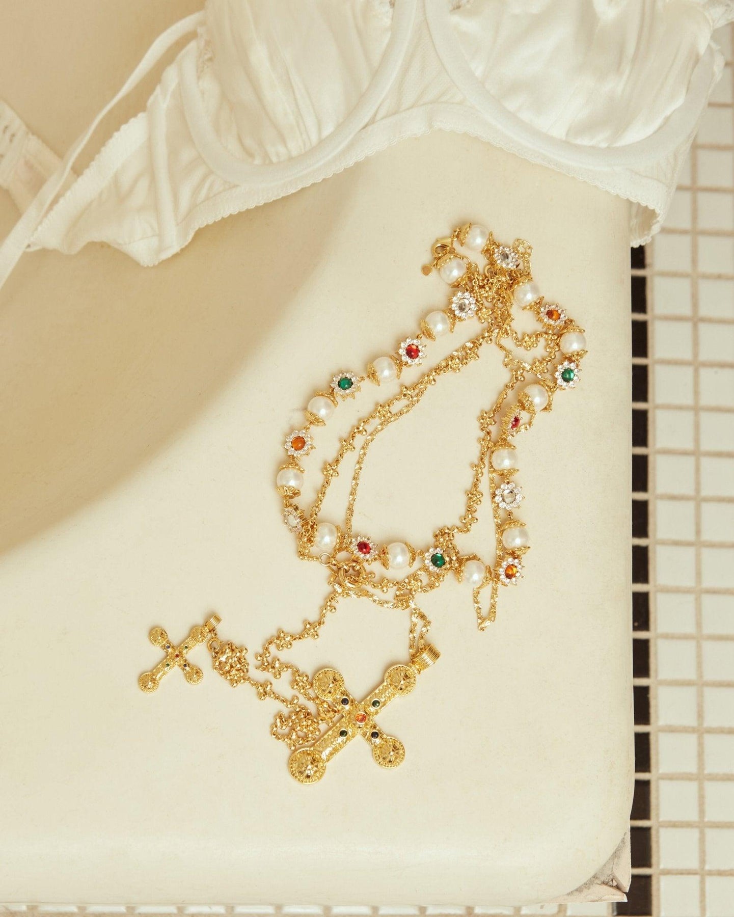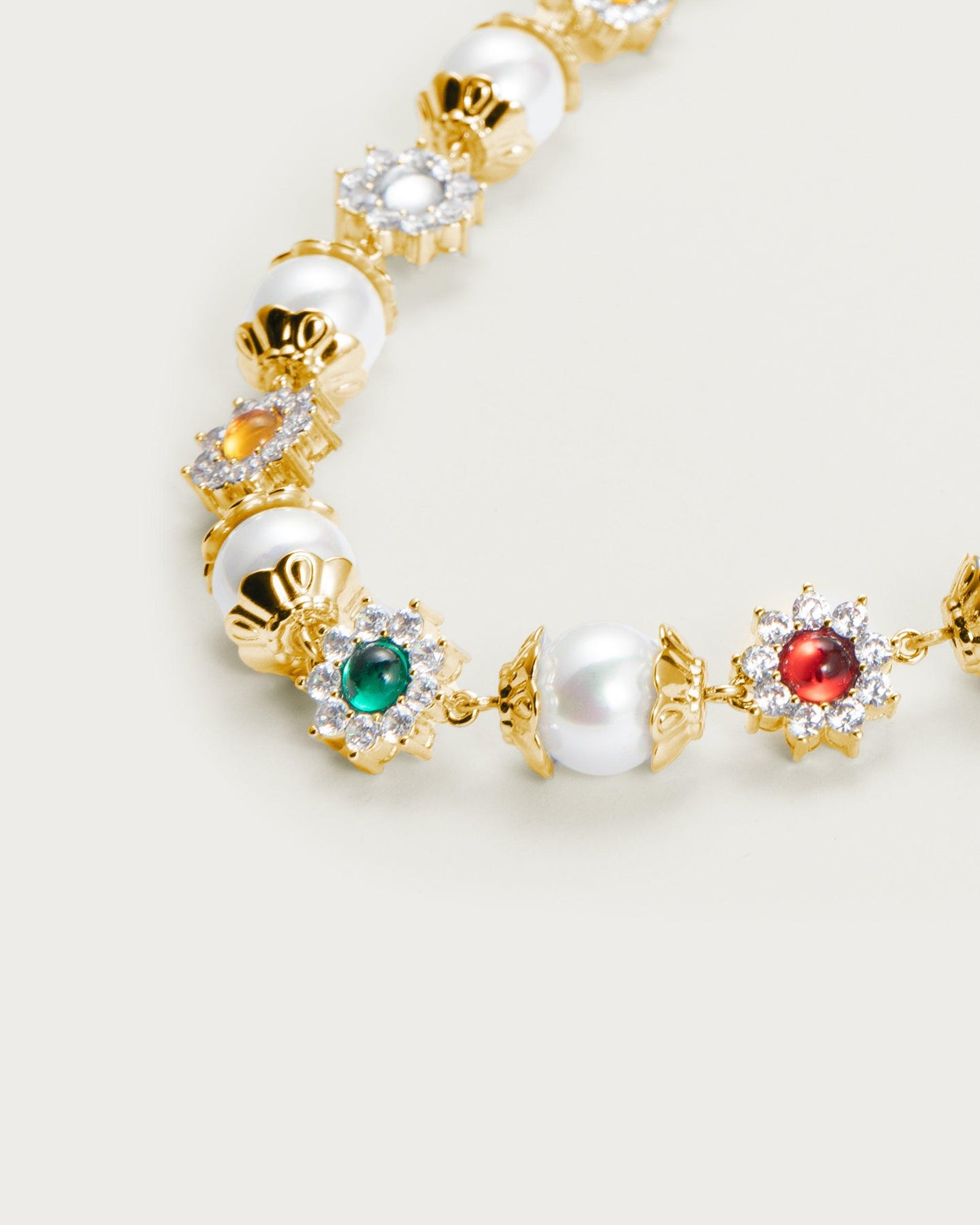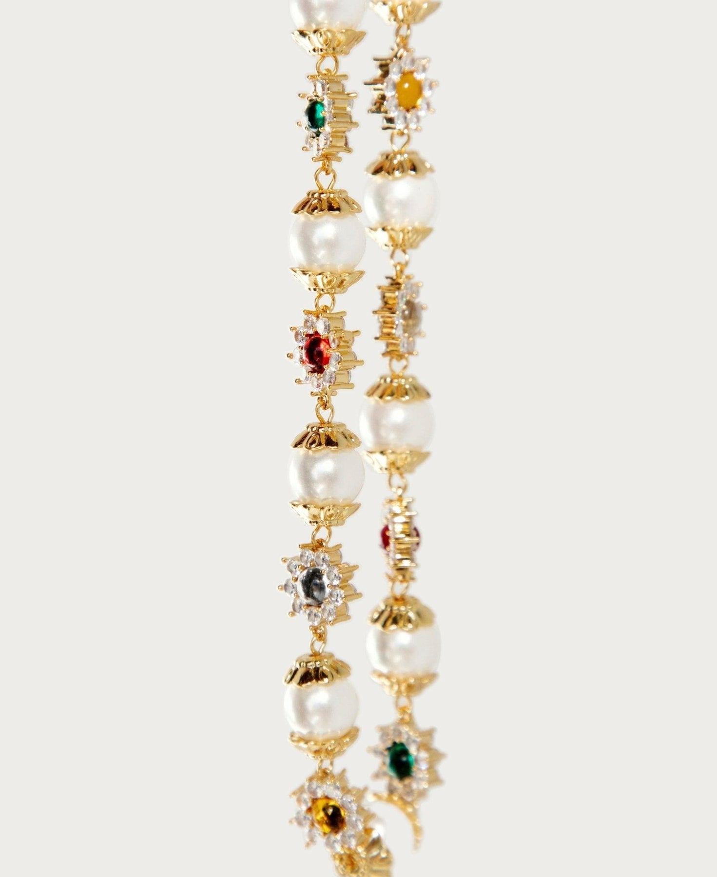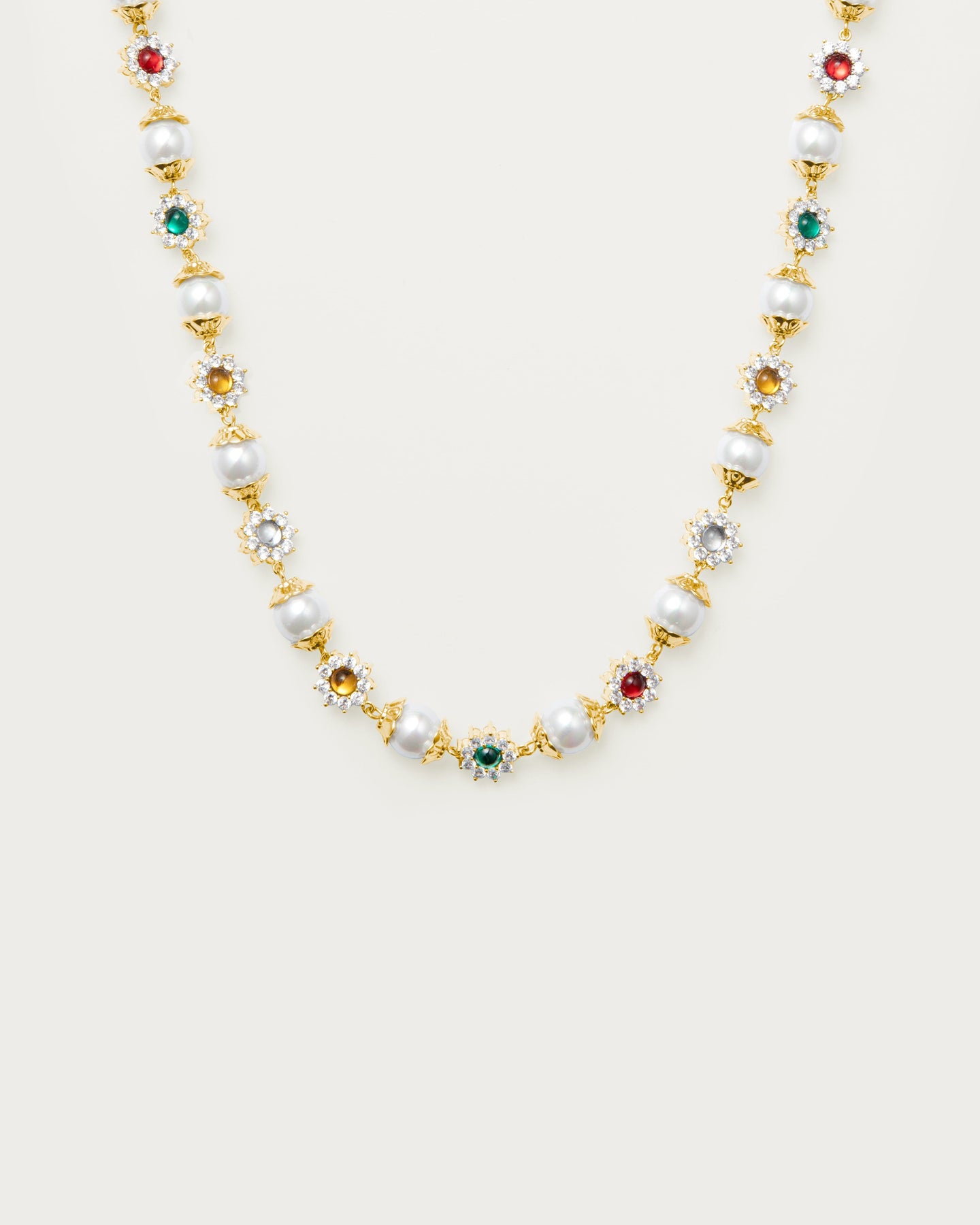 This breathtaking necklace blends pearls, gleaming silver petals, and vibrant red and green gems to imbue any utilitarian look with timeless allure.