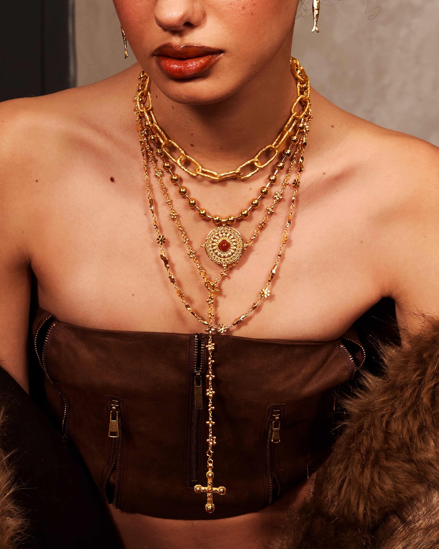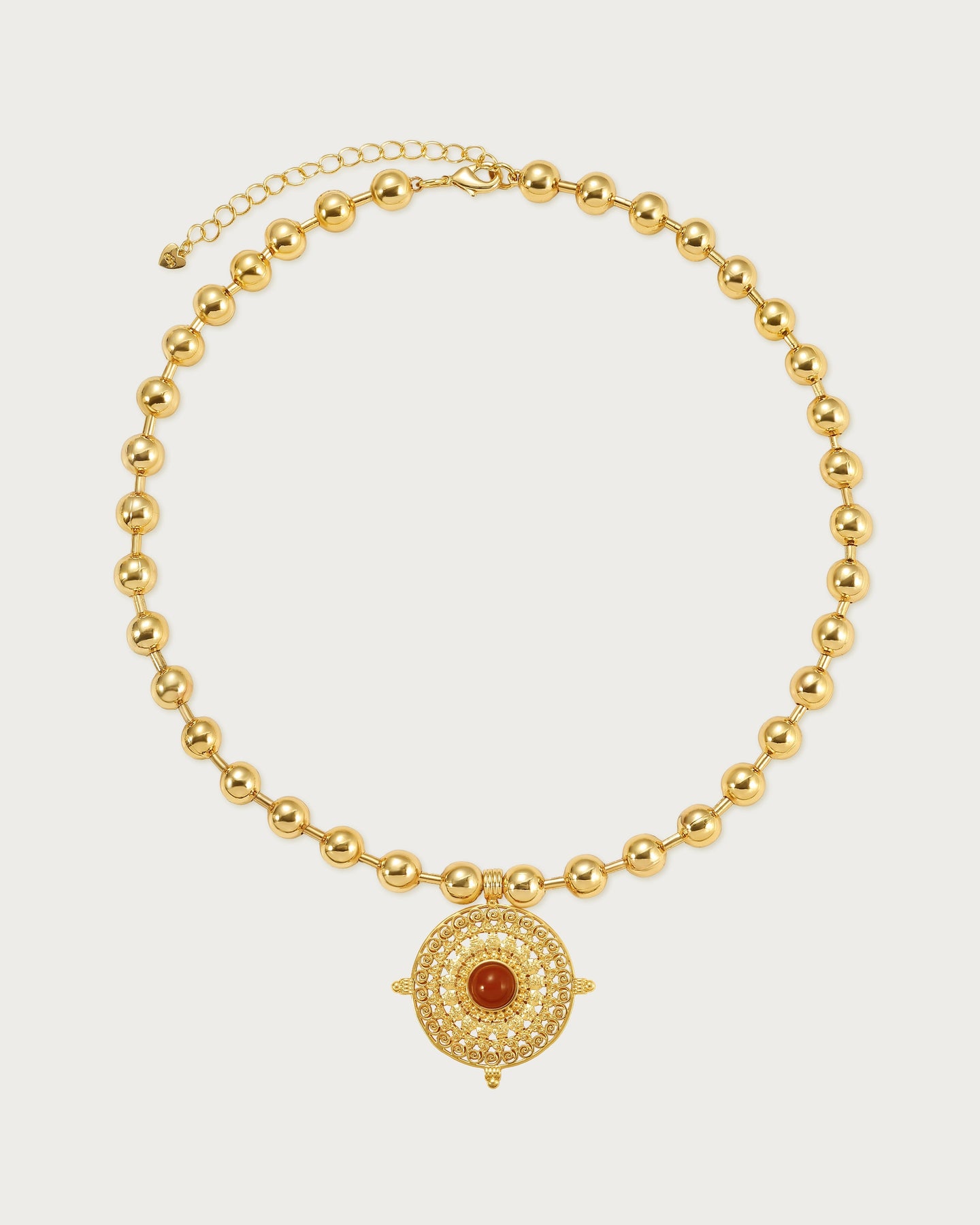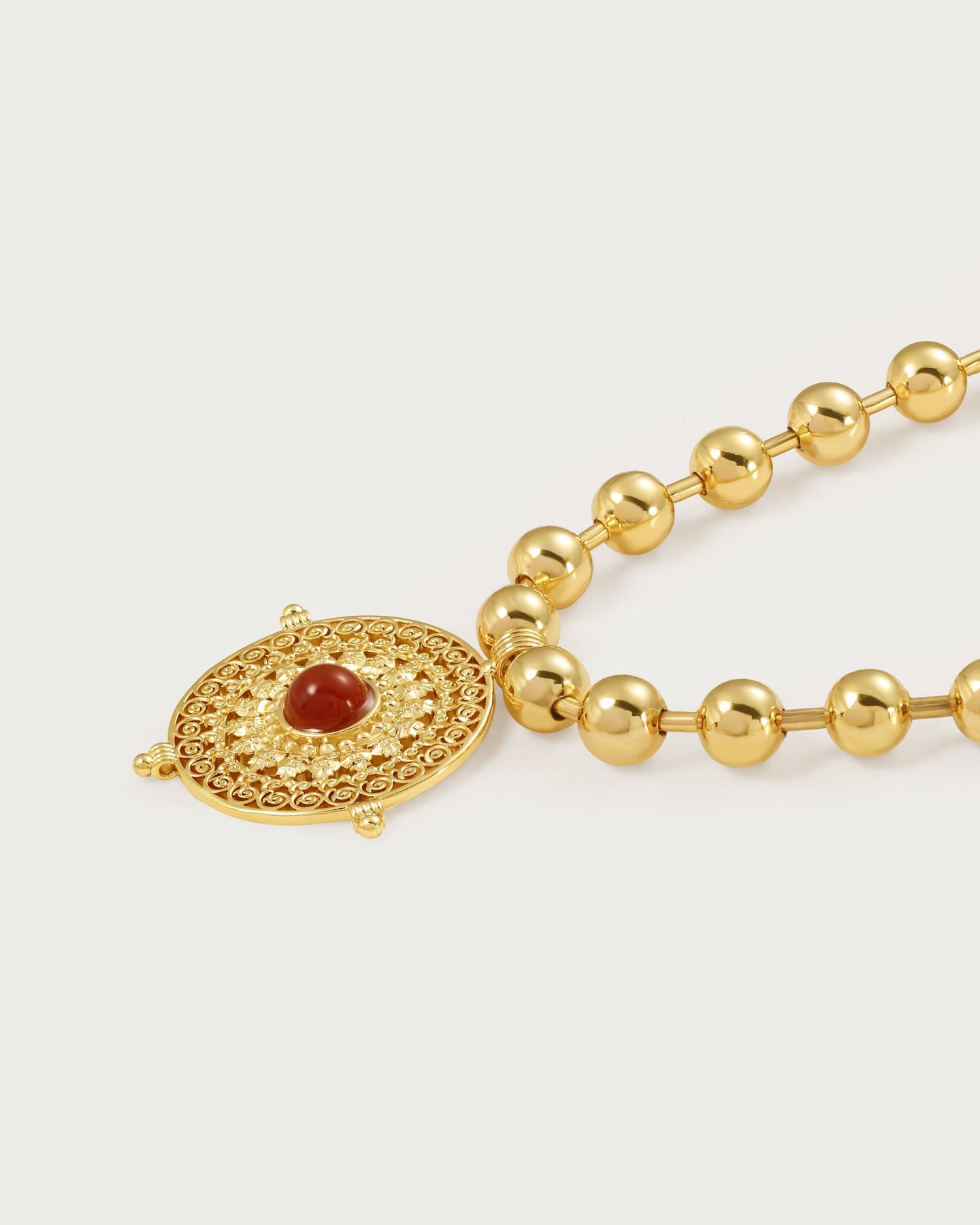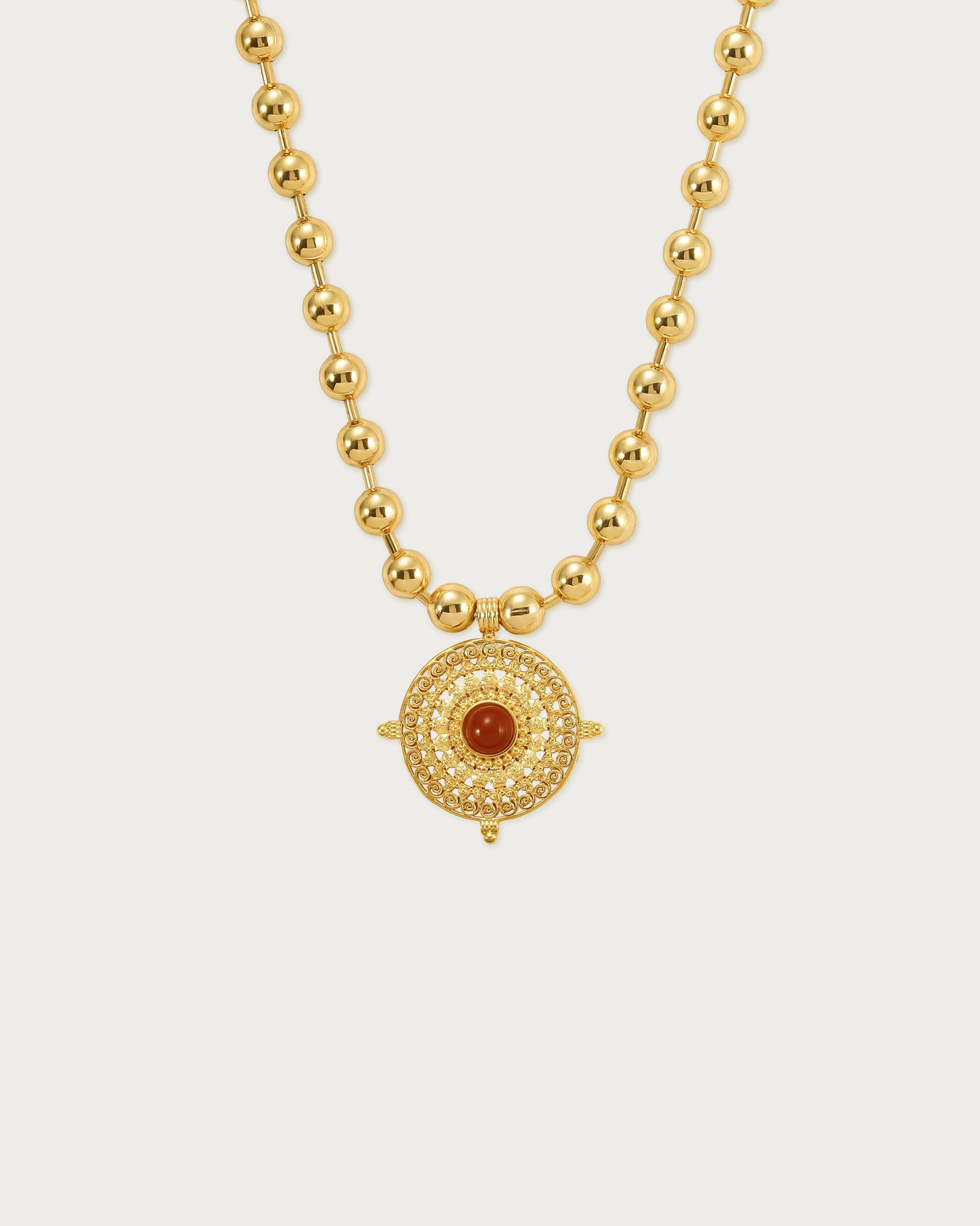 "On a land bathed in golden sunlight, our hearts pulse, fueling our energy, leading us to use this human body to feel the world." That's the inspiration behind this necklace. At the center of its pendant, with a retro pattern engraved, twinkles a red natural stone—carnelian. The necklace's ball bead chain, a unique design not commonly seen, creates a shining effect of light sprinkling on your neck.