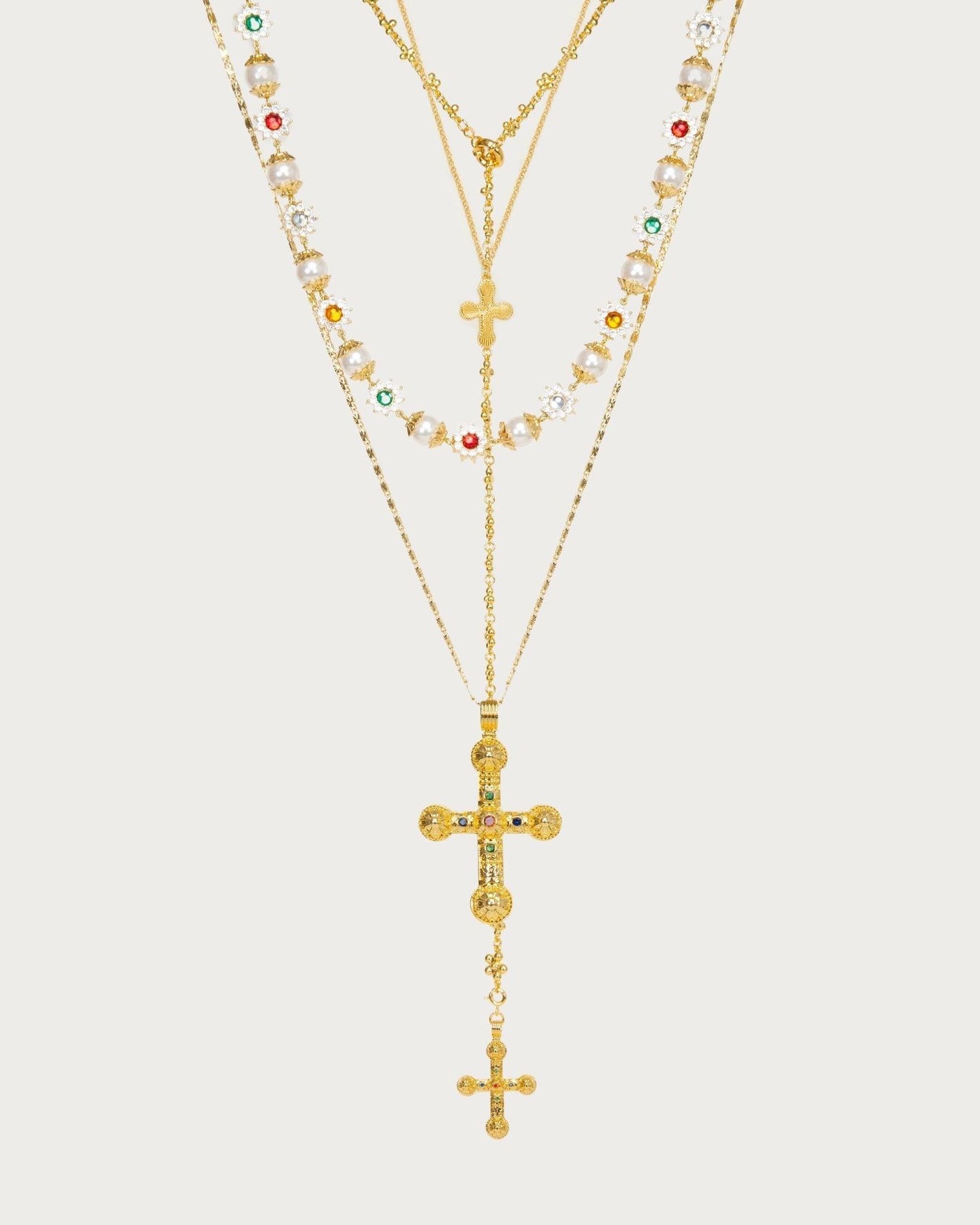 This Product Set includes Daisy Molecule Chain, Daisy Pearl Necklace, Mini Cross Pendant Necklace in Gold and XL Cross Chain. Step into the realm of reinterpreted “Regency” with this unique and captivating jewelry set – A harmonious blend of artisanal craftsmanship and edgy, street-inspired style, the daisy inspired droplet and cross pendant commands attention and elevates any streetwear moment to a work of fashion and art.