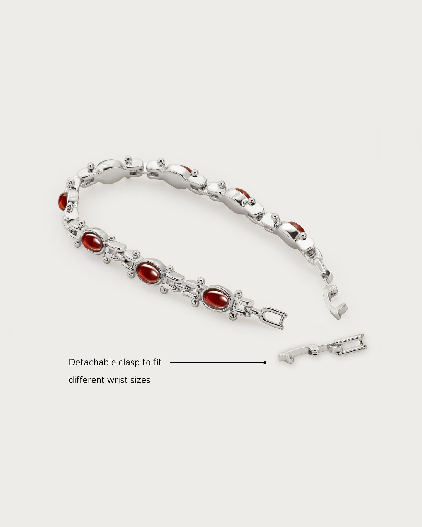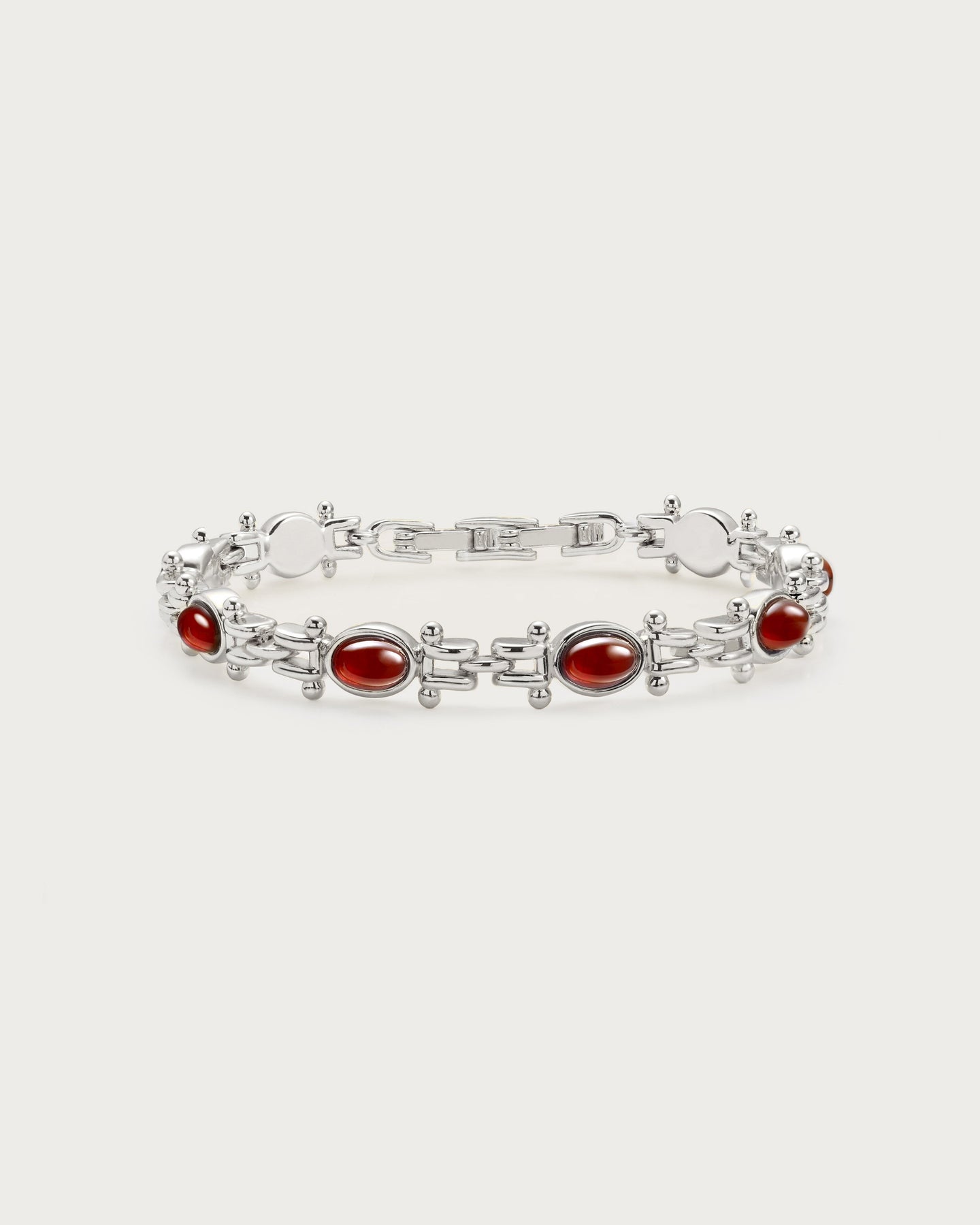 We want to use the saddle-inspired shape of this bracelet intertwined with the red carnelian stone to express "overlocking love." The carnelian stone is a charming natural stone symbolizing "love." Its unique and vibrant color and luster make it a perfect highlight for everyday wear. Just as Tess embodies both strength and vulnerability, this piece celebrates the multifaceted power of womanhood. Wear it, and carry love with you.